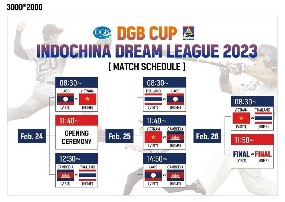 Cúp Bóng chày DGB Cup 2023 diễn ra từ 24-26/2 gồm có 4 đội tuyển trong khu vực tham gia bao gồm: Campuchia, Lào, Thái Lan và Việt Nam. Theo lịch dự kiến, đội tuyển Việt Nam sẽ gặp đội tuyển Lào sáng 24/2, gặp đội tuyển Campuchia sáng 25/2 và gặp đội tuyển Thái Lan sáng 26/2. Các đội thi đấu vòng tròn, 2 đội nhất nhì sẽ vào chung kết và trận đấu này sẽ diễn ra vào chiều 26/2.