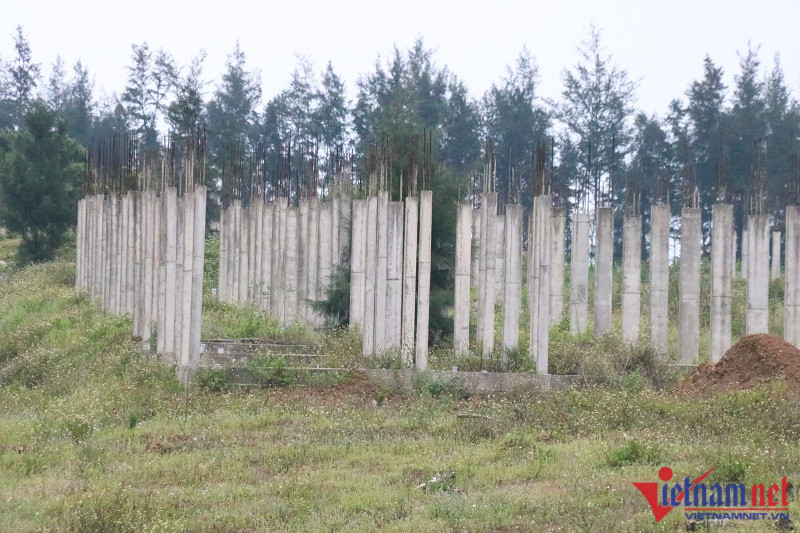 Sau nhiều năm tạm dừng thi công, bên trong khuôn viên dự án hiện tại là nhiều móng trụ với cột bê tông ngổn ngang sắt thép của các căn biệt thự dang dở, ố màu thời gian.