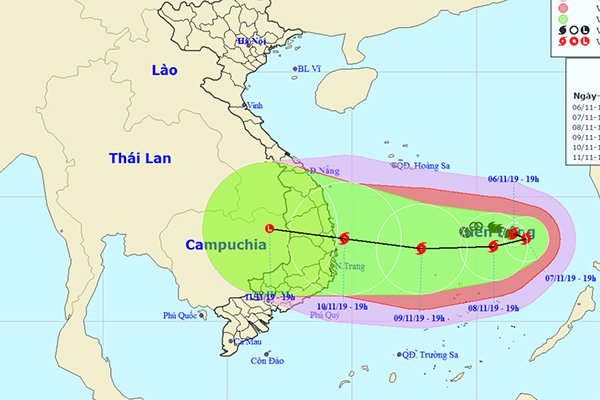Đến 19h ngày 10/11, vị trí tâm bão ở trên vùng biển các tỉnh Quảng Ngãi đến Ninh Thuận.