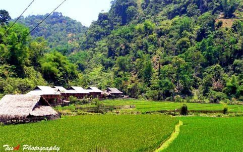 | Bản Kho Mường ở Pù Luông (Thanh Hóa) là một điểm được khách tây rất thích vì hoang sơ và vị thế đẹp khi nằm lọt thỏm giữa ngọn núi. Ảnh: TusA (PNTD) |