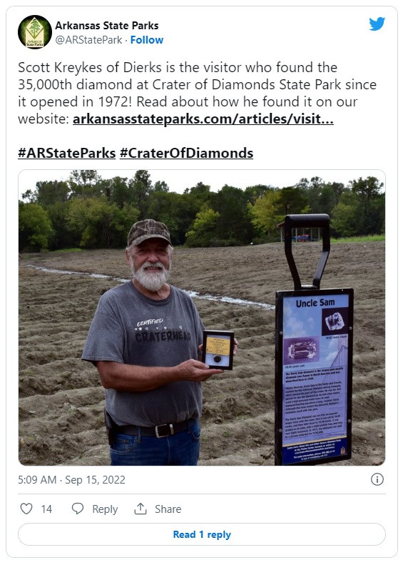 Vào đầu tháng này, ông Scott Kreykes, ở Dierks, Arkansas, đã tìm thấy viên kim cương thứ 50 chỉ tính riêng trong năm 2022. Đây cũng là viên kim cương thứ 35.000 được đăng ký tại công viên, theo thông cáo báo chí từ Arkansas State Parks.