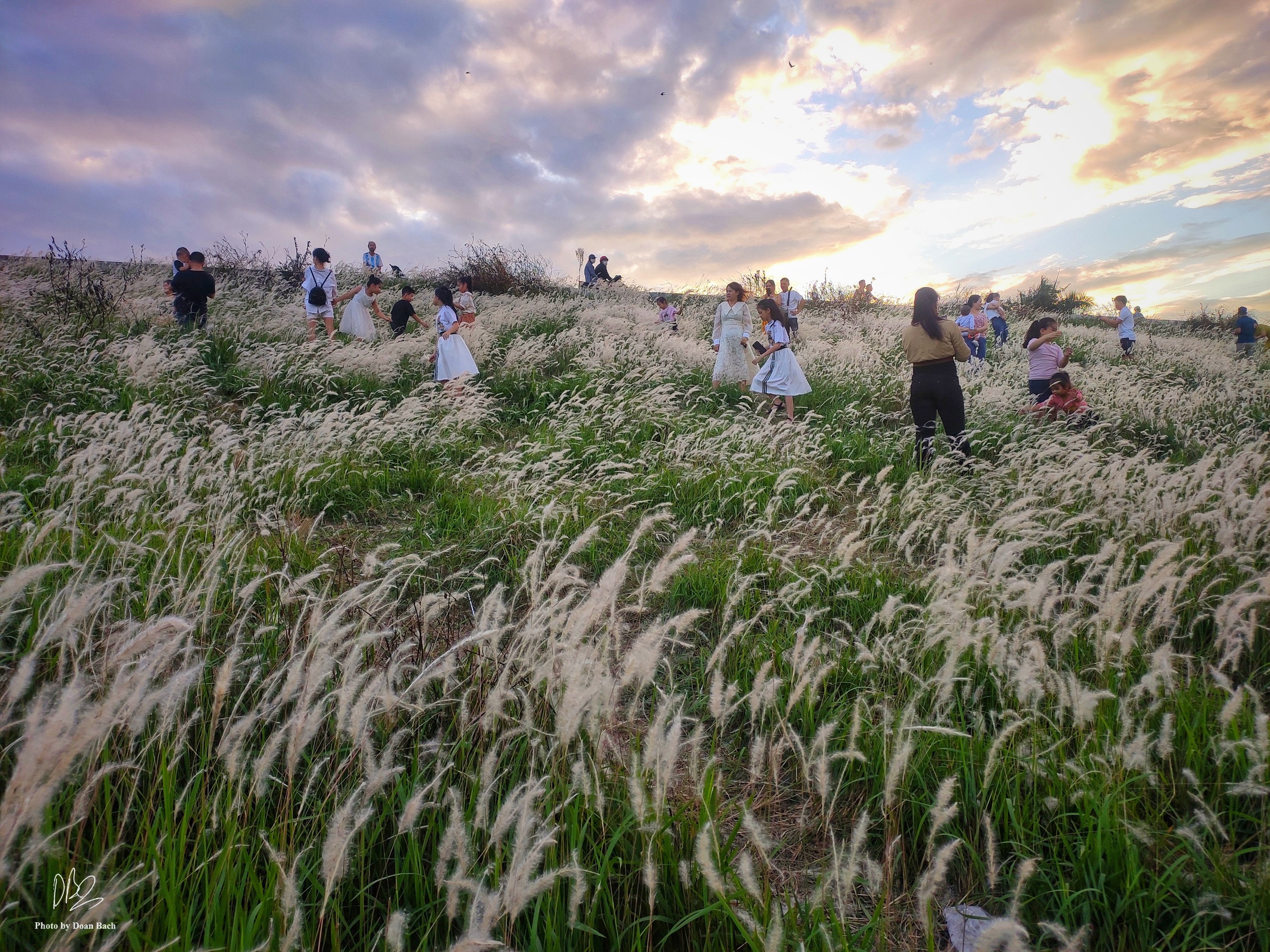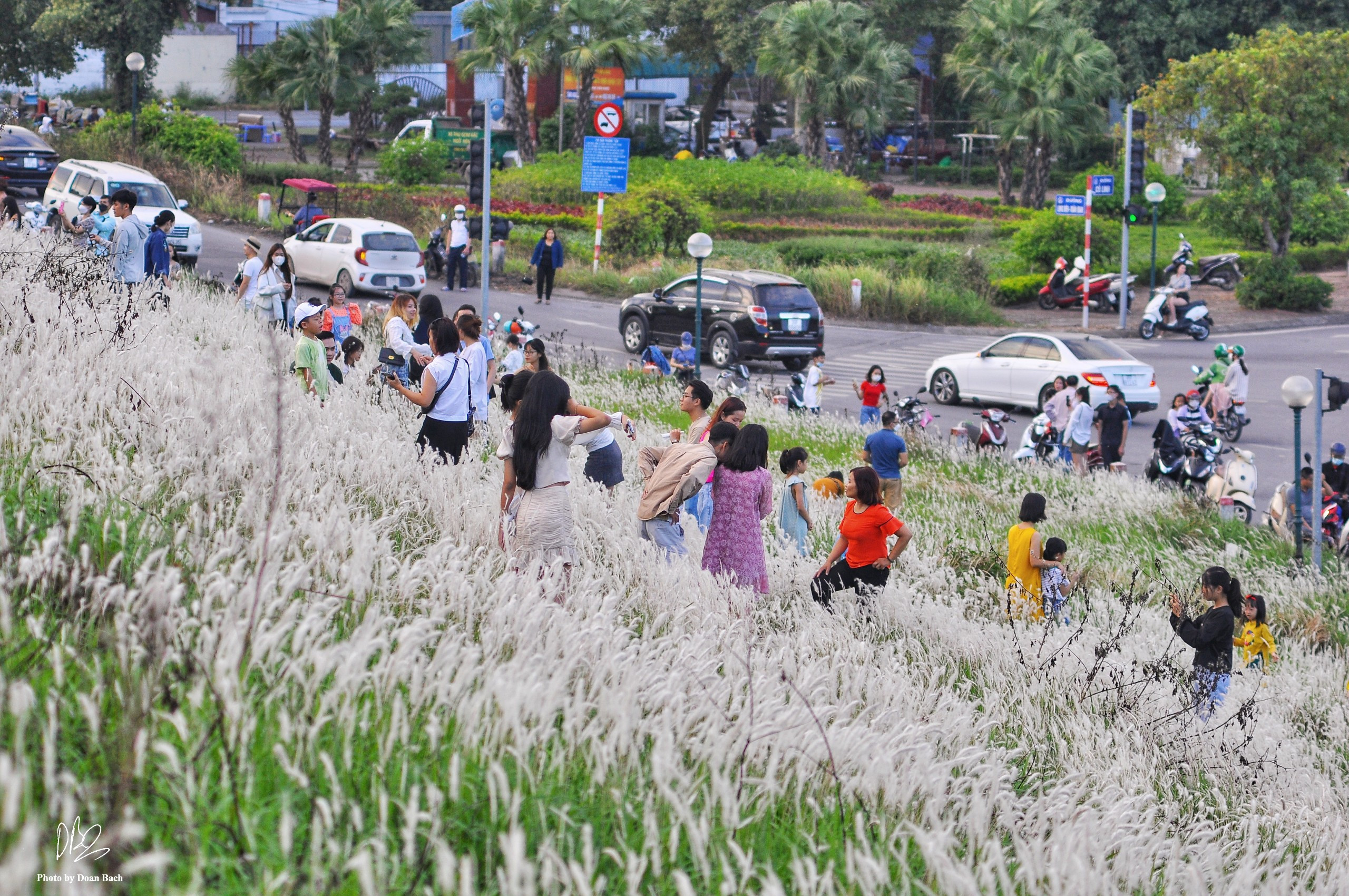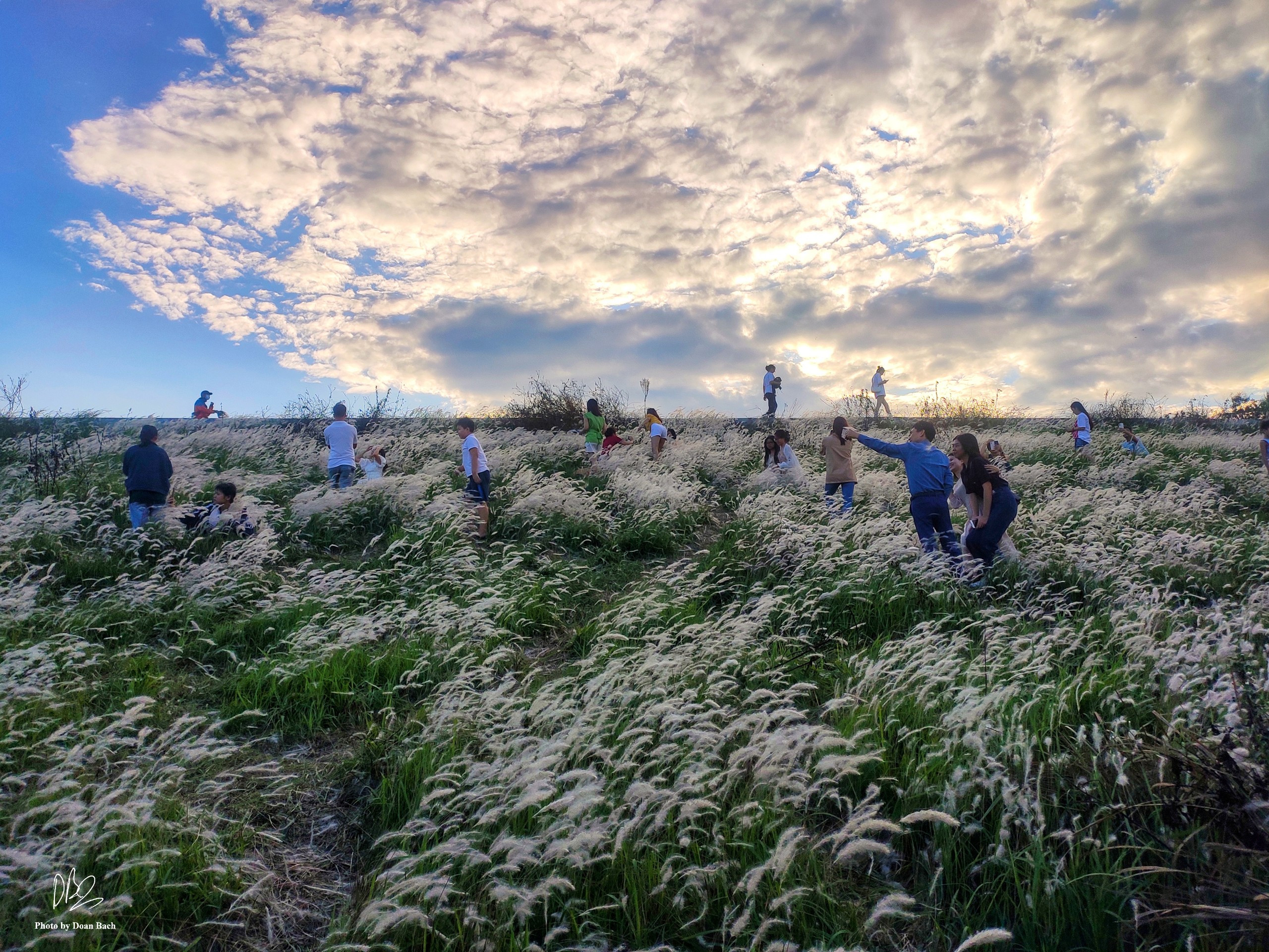 Độ cuối tháng 11, đầu tháng 12, lúc giao mùa từ thu sang đông là thời điểm cỏ lau ở đây bắt đầu nở rộ. Những bông cỏ lau màu trắng muốt, đung đưa theo gió tạo khung cảnh đẹp nên thơ.