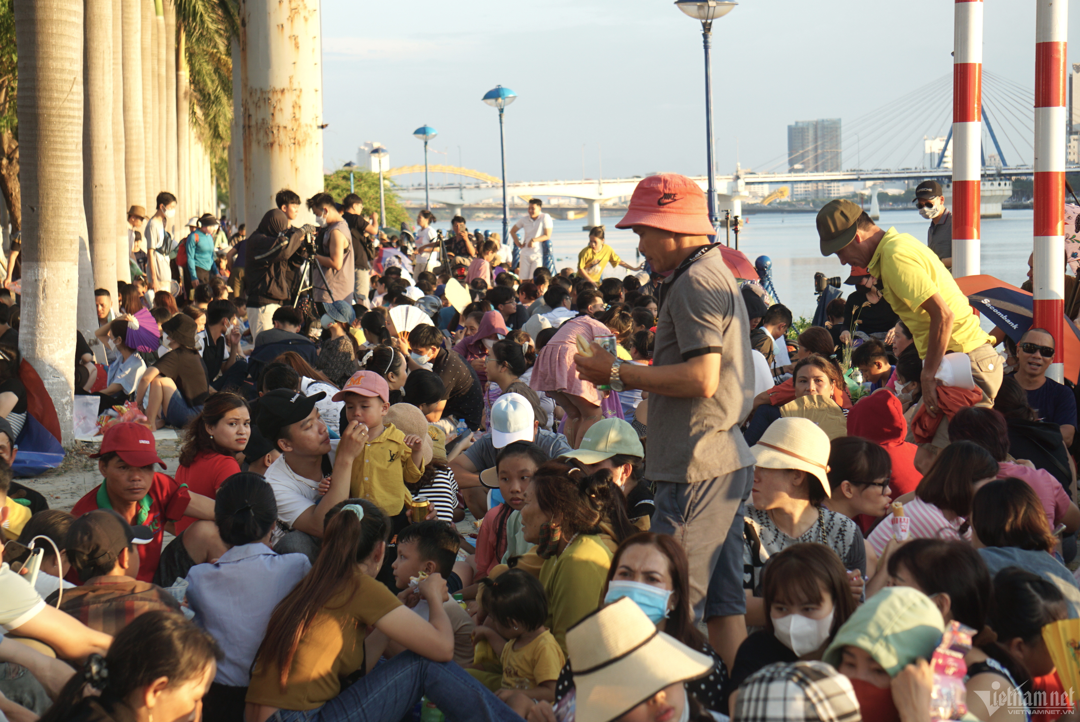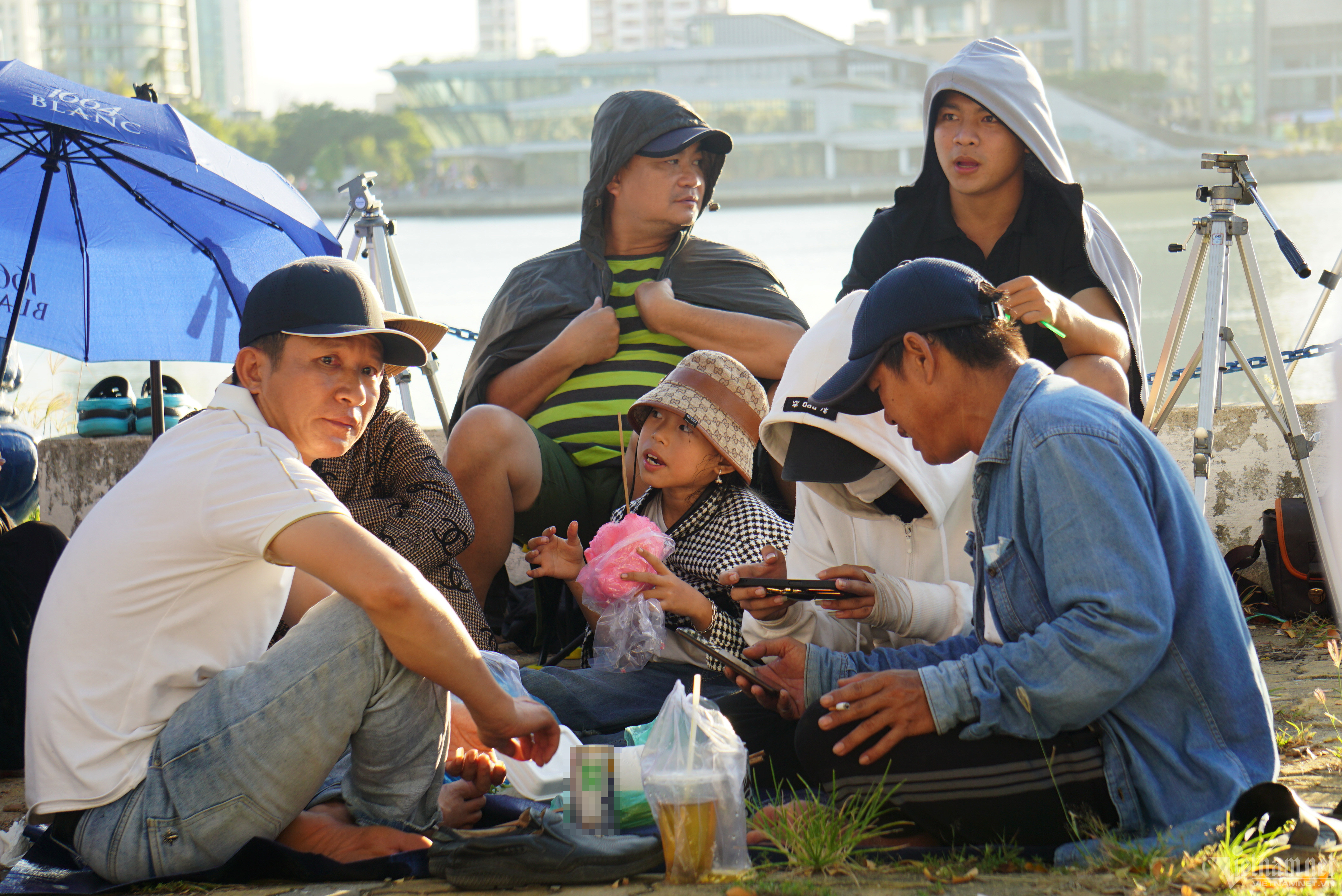 Du khách mang theo thức ăn ngồi đợi xem pháo hoaTâm Anh cùng mẹ đi từ 17h để chọn vị trí đẹp, gần sát khán đài Nhóm du khách quê Nghệ An tranh thủ check-in trong lúc chờ xem pháo hoaKhông chỉ du khách trong nước, nhiều du khách nước ngoài cũng đến bờ sông Hàn đợi xem pháo hoaLượng người đổ về công viên dọc bờ sông Hàn càng lúc càng đông đông Nhiều gia đình chọn các điểm trên cầu Sông Hàn, cầu Thuận Phước... vì không kịp xí chỗ trong công viên