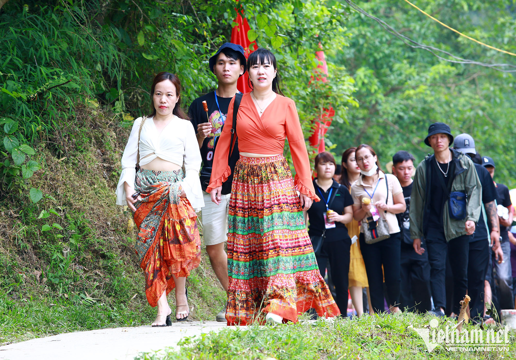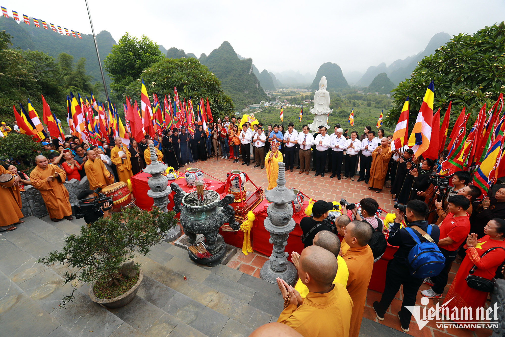 Từ 7h30 phút sáng, rất đông du khách đã có mặt để tham gia Lễ rước nước thiêng từ Thác Bản Giốc (Cao Bằng) lên điện chính chùa Phật tích Trúc Lâm Bản Giốc.