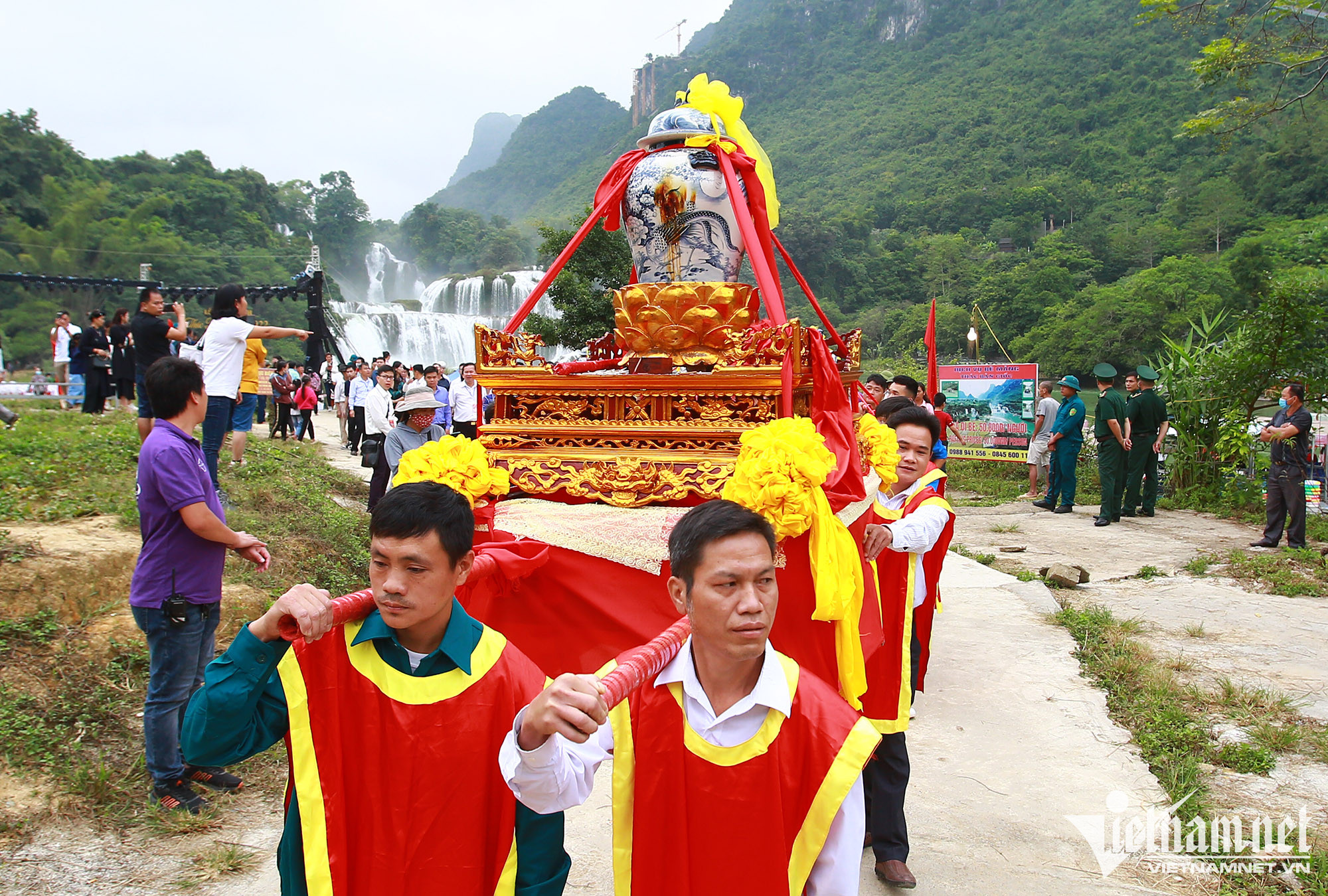 Sáng nay (8/10), hàng ngàn người dân, du khách đổ về Lễ hội Thác Bản Giốc, huyện Trùng Khánh, tỉnh Cao Bằng. Từ 7h30 phút sáng, rất đông du khách đã có mặt để tham gia Lễ rước nước thiêng từ Thác Bản Giốc lên điện chính chùa Phật tích Trúc Lâm Bản Giốc, cầu cho quốc thái dân an, bày tỏ lòng biết ơn với các bậc tiền nhân khai quốc, các anh linh của những liệt sỹ đã hy sinh bảo vệ tổ quốc; cầu mong mưa thuận gió hòa, mùa màng bội thu, ấm no cho người dân.