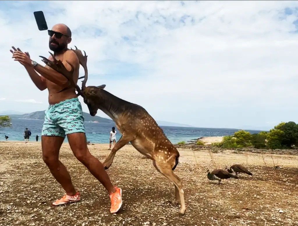 Trong đoạn phim do Erika quay, du khách cởi trần là Triacca được nhìn thấy đang chụp ảnh các con vật hoang dã bằng điện thoại của mình thì bất ngờ một con hươu đực khổng lồ cách đó vài mét lao tới húc mạnh vào lưng nam du khách.