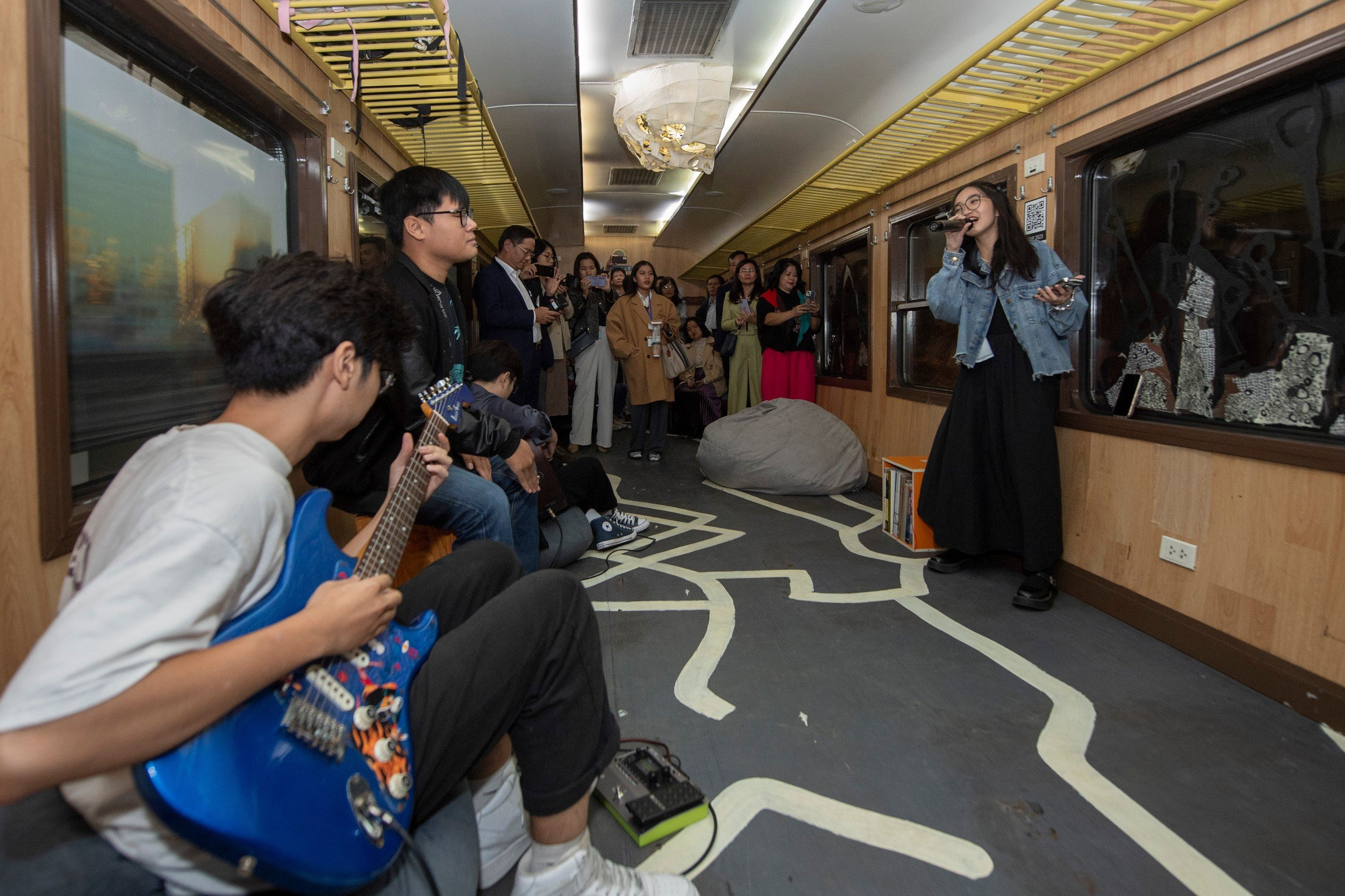Du khách thích thú trải nghiệm đoàn tàu di sản có hành trình từ ga Hà Nội qua ga Long Biên, đến ga Gia Lâm và ngược lại