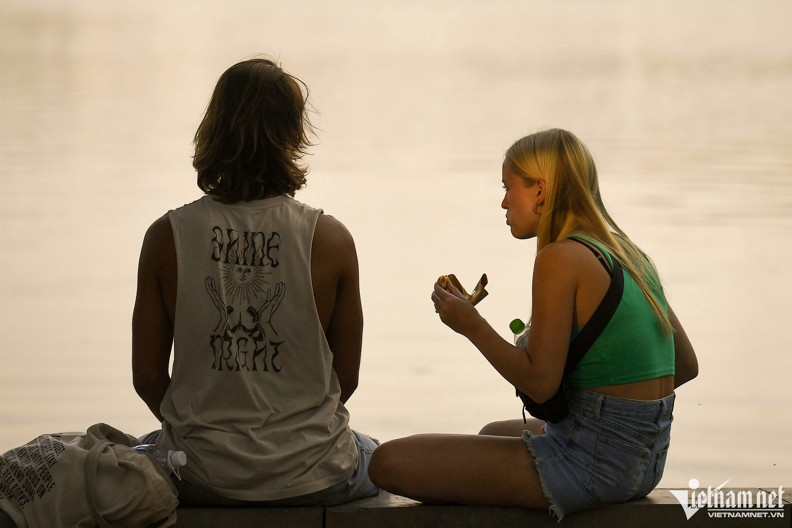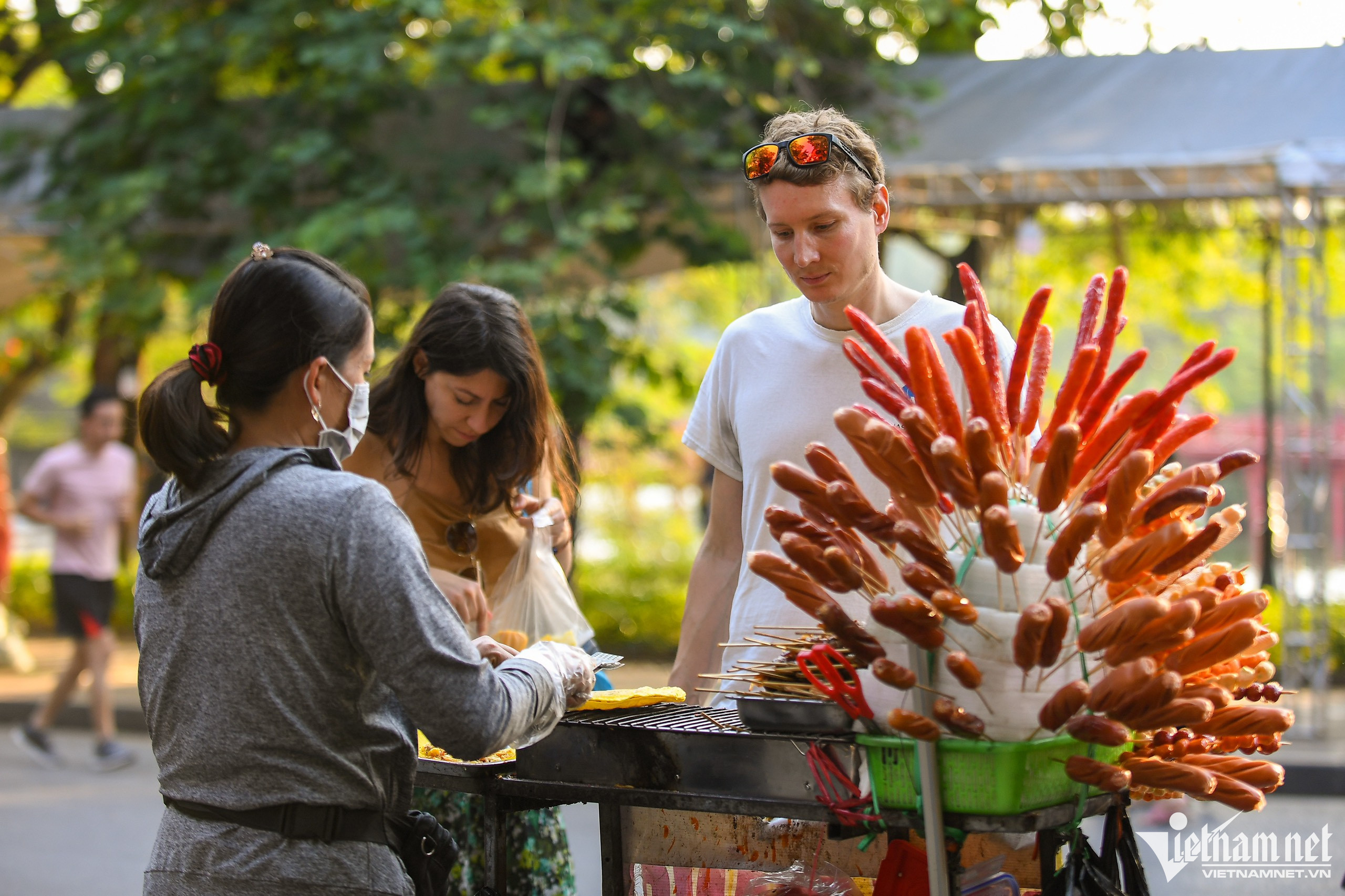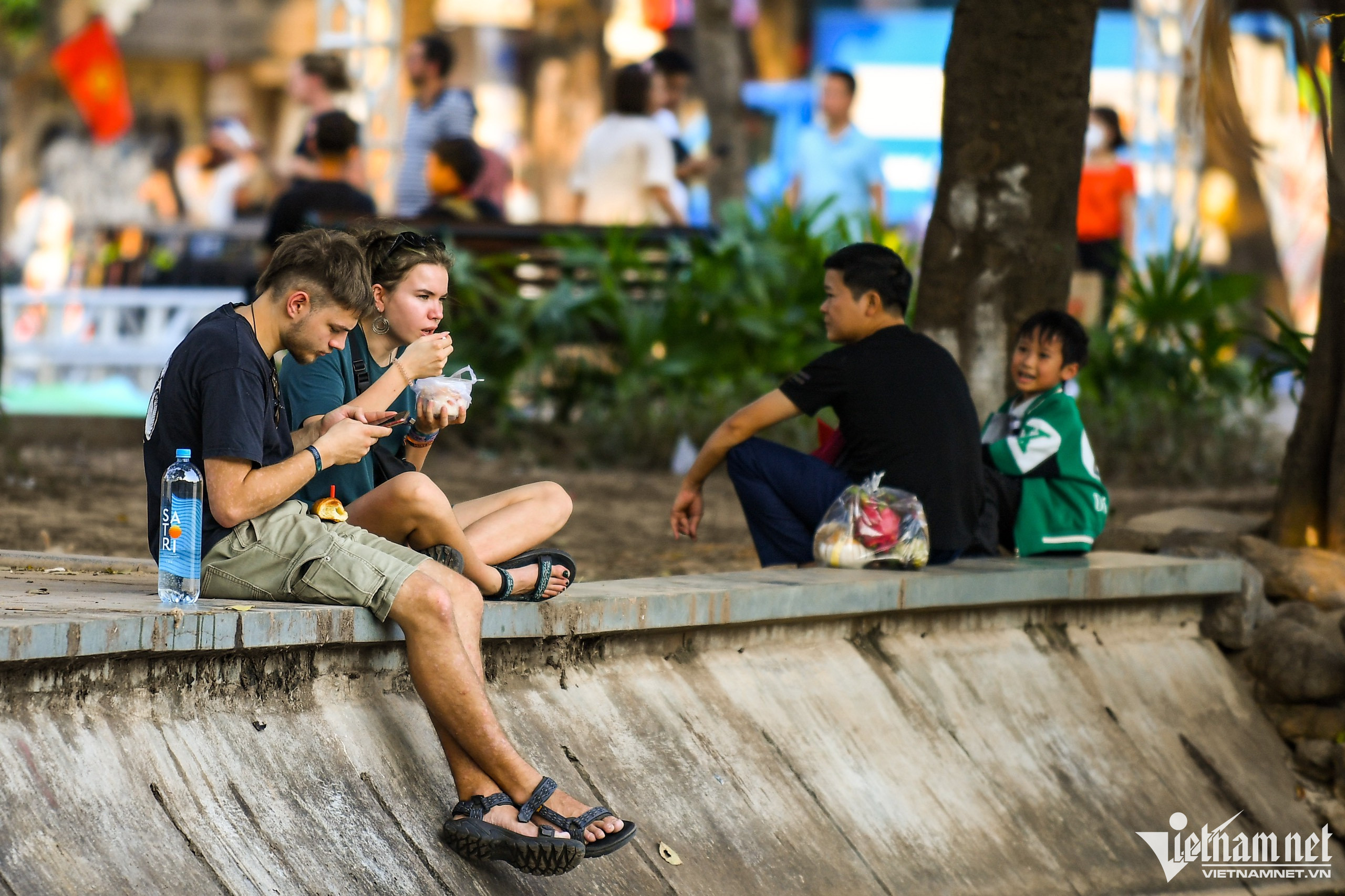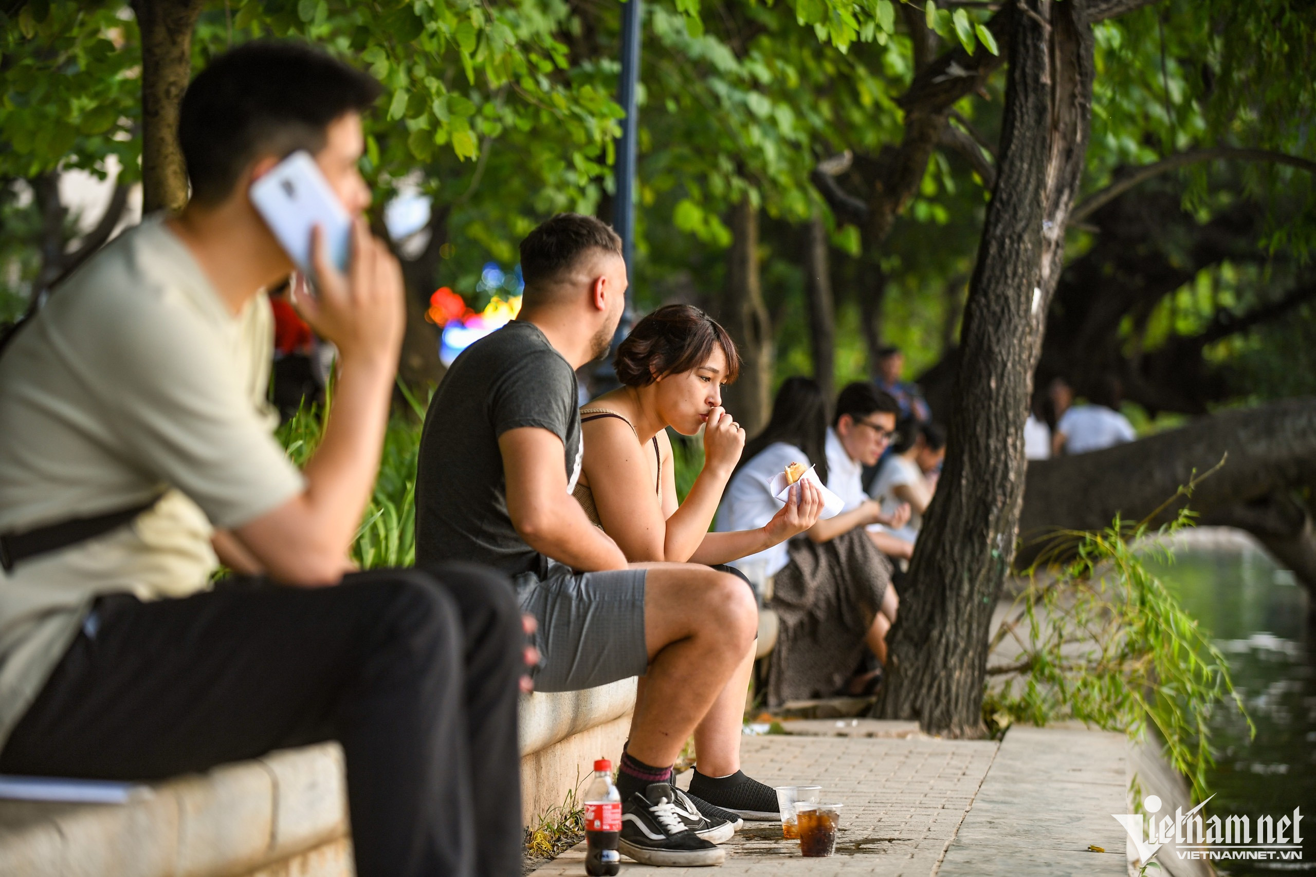 Cuối buổi chiều, tại khu vực ven hồ, nhiều cặp đôi người nước ngoài ngồi hóng gió, trò chuyện và thưởng thức ẩm thực Việt Nam.