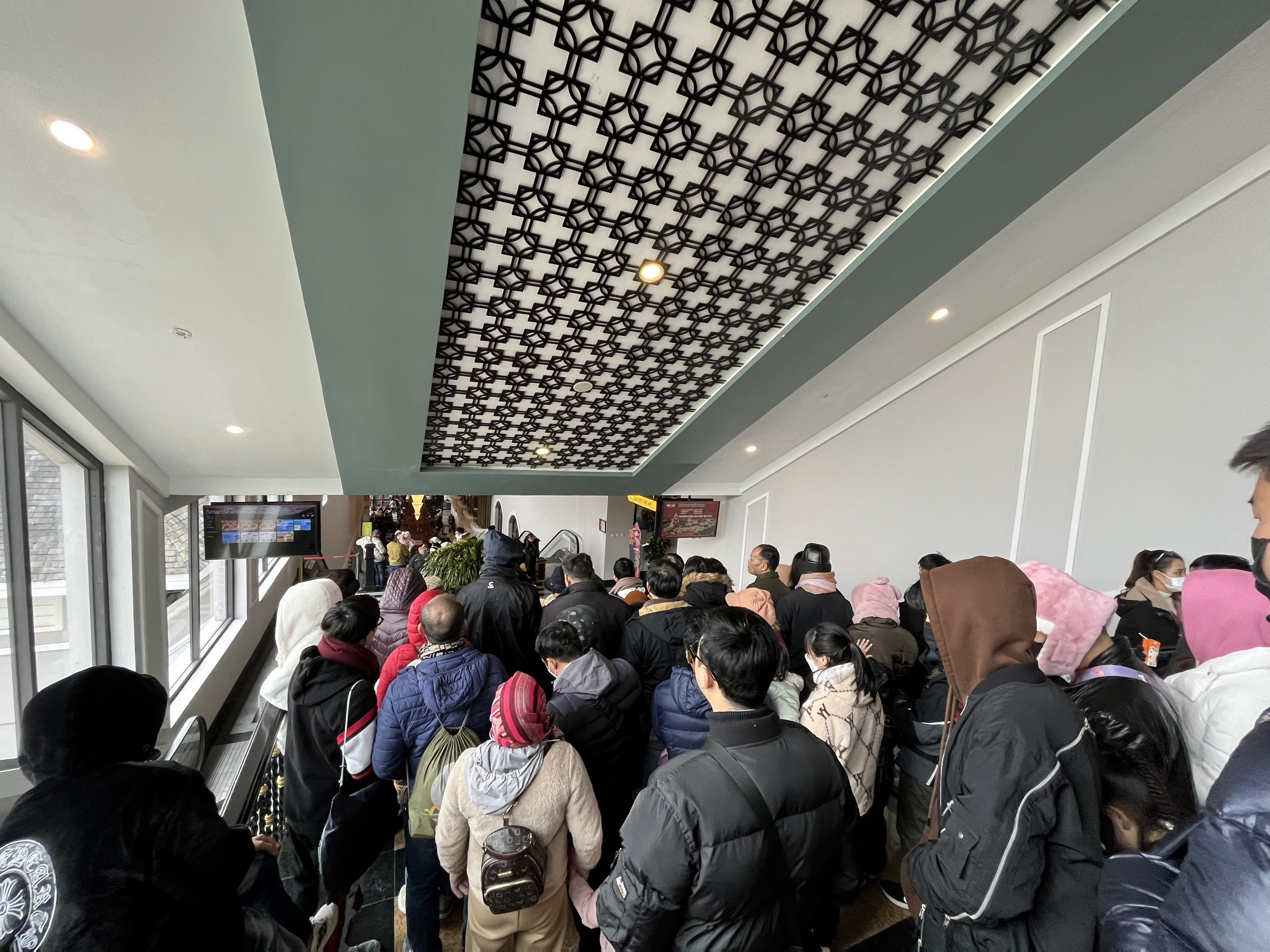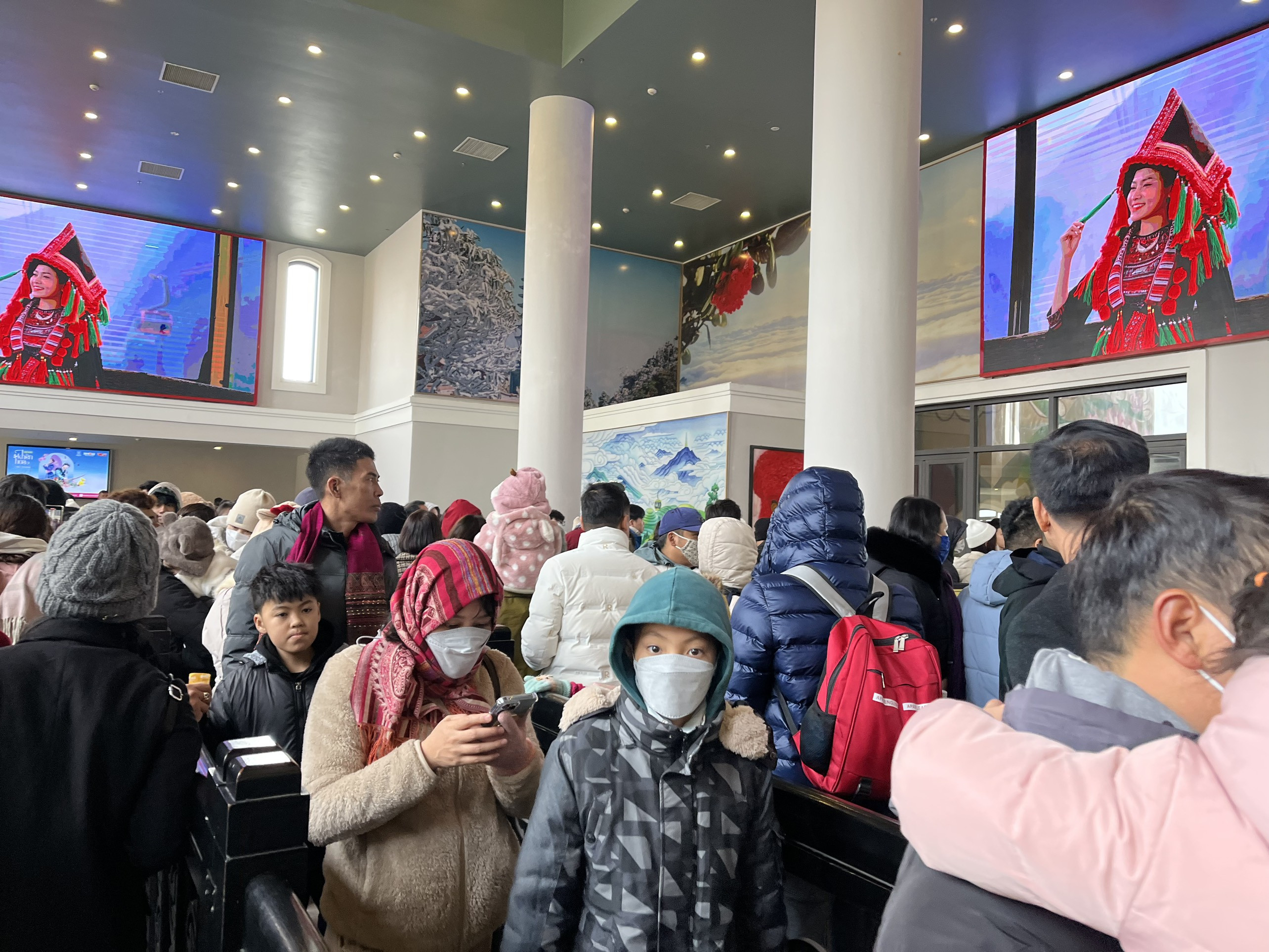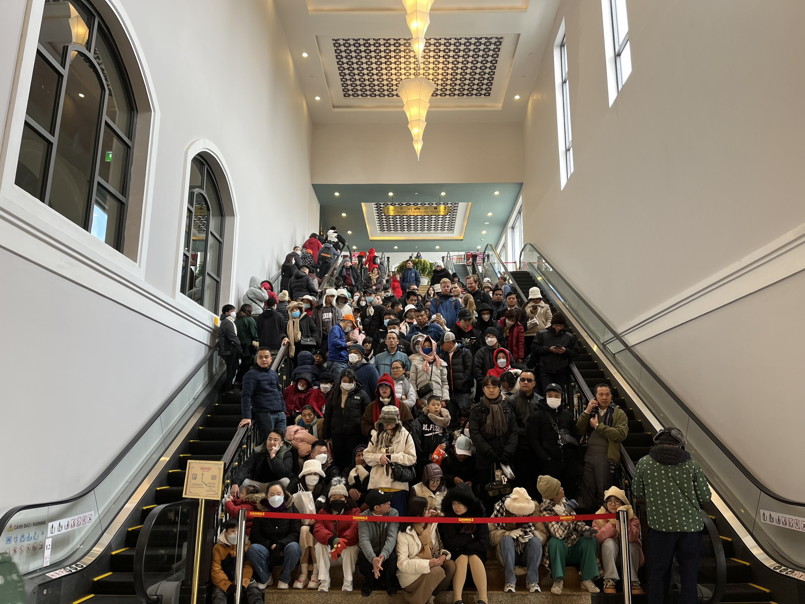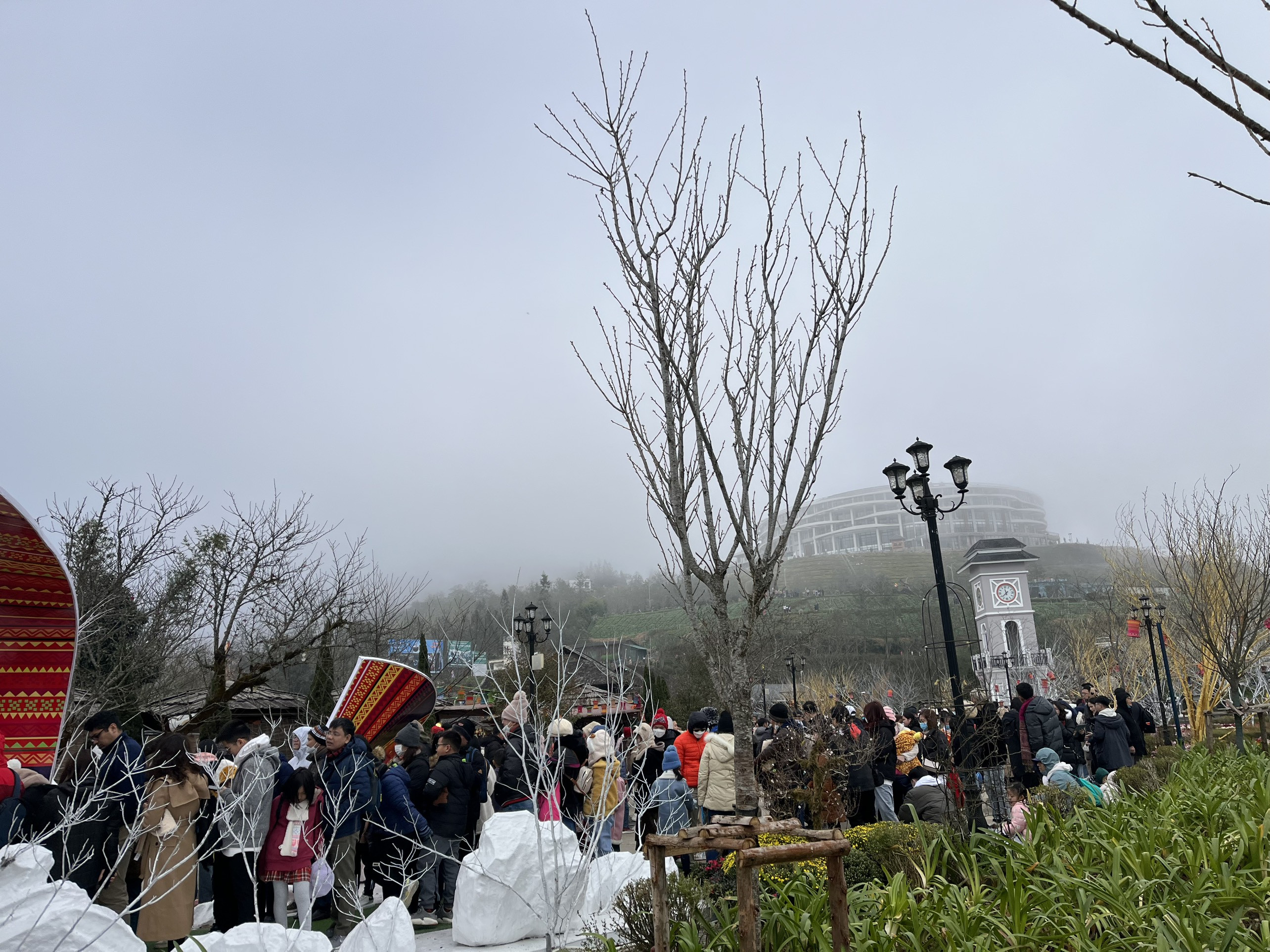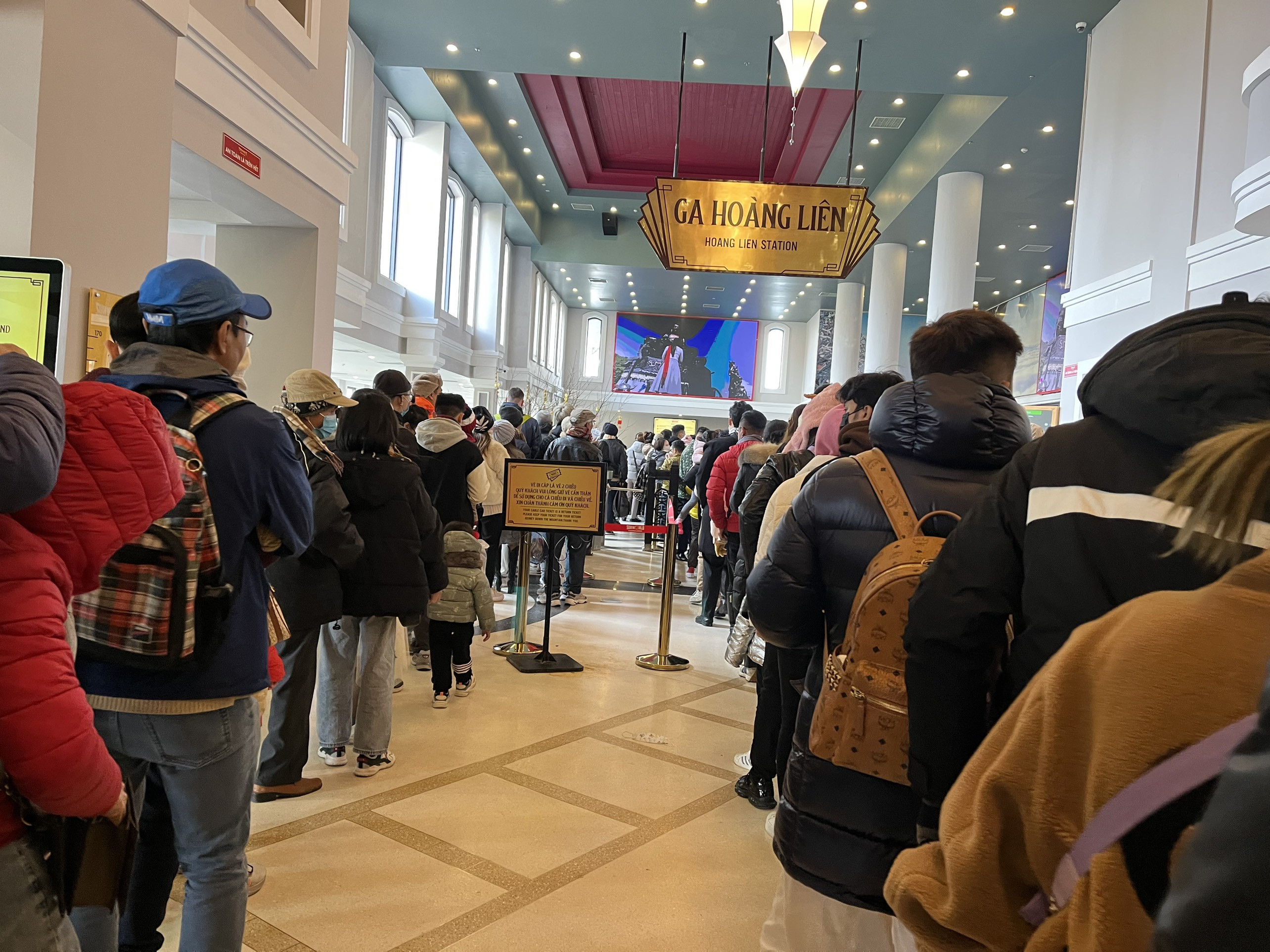 Lượng khách đông đúc đổ về khu vực ga cáp treo lên đỉnh Fansipan sáng mùng 4 Tết Quý Mão 2023 dẫn đến ùn tắc cục bộ. Nhiều người phải xếp hàng xuyên trưa, chờ 3-4 tiếng để mua vé lên cáp treo.