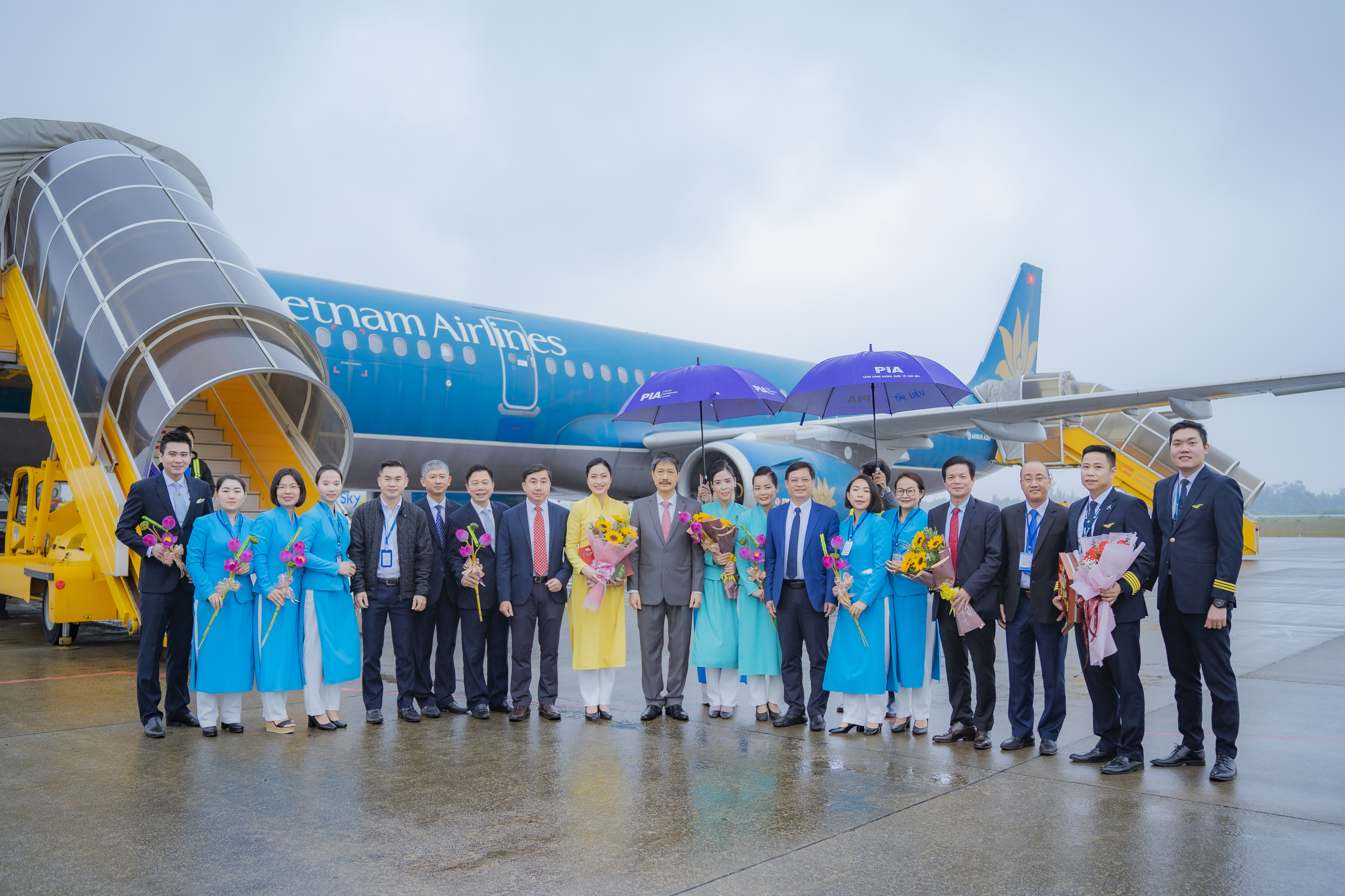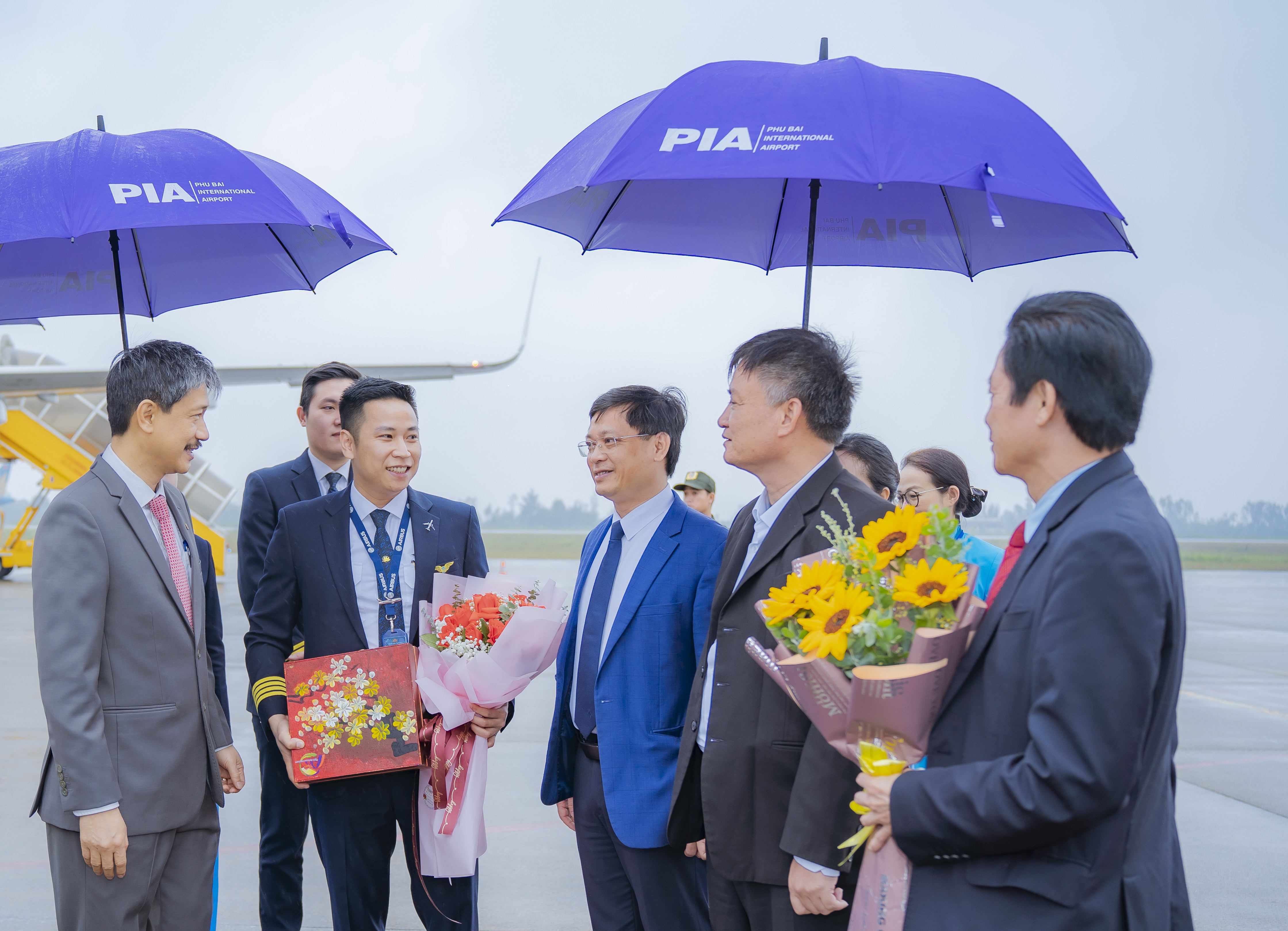 Tại đây, nhóm hành khách đầu tiên cùng cơ trưởng và tiếp viên trưởng của chuyến bay được lãnh đạo UBND tỉnh và các ban ngành đón tiếp, trao hoa và tặng quà lưu niệm chúc mừng năm mới.