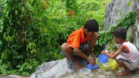 | Các cậu bé địa phương giúp du khách nhí vượt núi trèo non. |