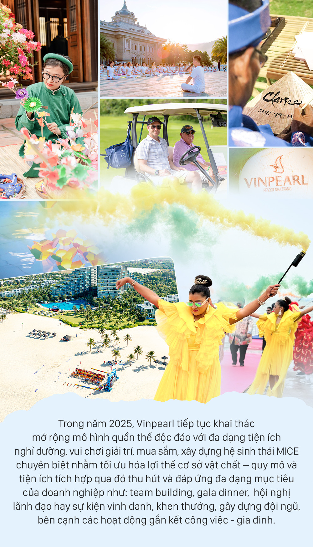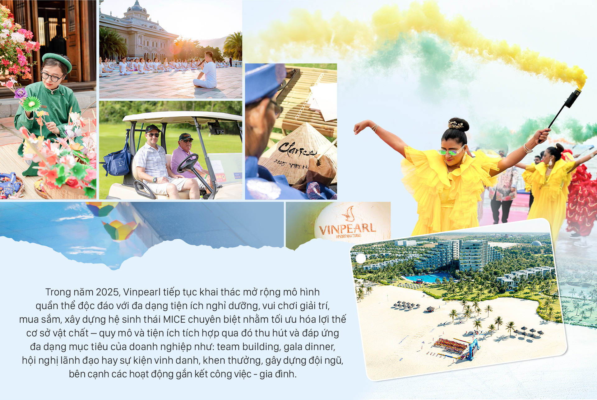 Trong năm 2025, doanh nghiệp này tiếp tục khai thác mở rộng mô hình quần thể độc đáo với đa dạng tiện ích nghỉ dưỡng, vui chơi giải trí, mua sắm, qua đó thu hút và đáp ứng đa dạng mục tiêu của khách hàng như: team building, gala dinner, hội nghị lãnh đạo hay sự kiện vinh danh, khen thưởng, gây dựng đội ngũ, bên cạnh các hoạt động gắn kết công việc – gia đình. Song song với đó, Vinpearl sẽ xây dựng hệ sinh thái MICE chuyên biệt, tập trung phát triển các trải nghiệm nghỉ dưỡng kết hợp hội họp đạt tiêu chuẩn quốc tế tại hệ thống quần thể với không gian tổ chức sự kiện quy mô lớn cùng chuỗi dịch vụ toàn diện và khép kín.