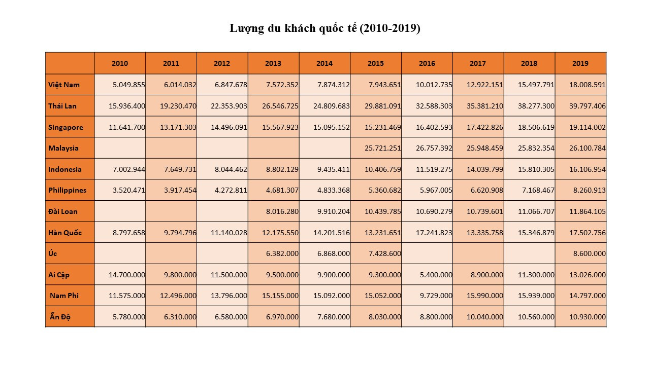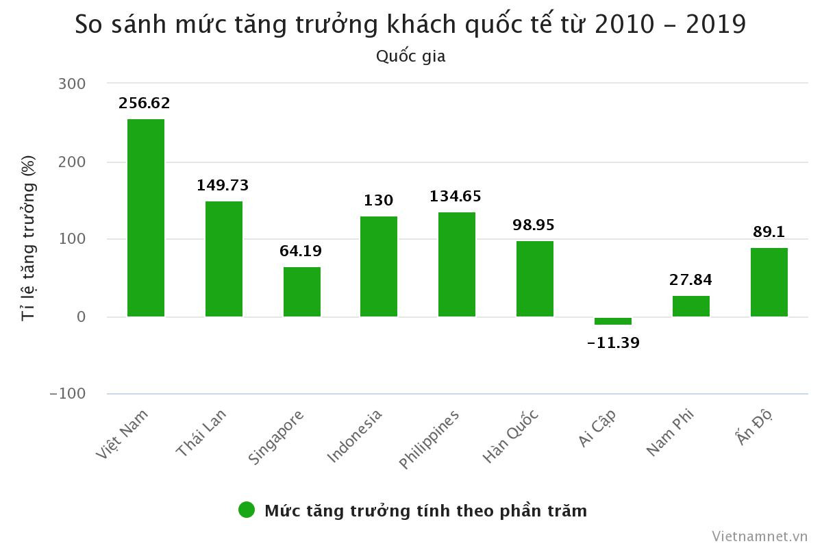 Về tỉ lệ tăng trưởng du khách quốc tế trong 10 năm (2010-2019), Việt Nam chúng ta có tốc độ tăng trưởng lên đến 257,62%, cao nhất trong 12 quốc gia nghiên cứu, cao hơn cả Thái Lan (149,73%). Về lượng khách quốc tế, Việt Nam từ vị trí số 11/12 năm 2010 tiến lên vị trí số 4/12 vào năm 2019.