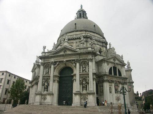 | Thánh đường Santa Maria Della Salute là một công trình hình bát giác, với hai mái vòm và một đôi tháp chuông ở phía sau. Thánh đường được xây dựng trên 100.000 cọc gỗ. Trên đỉnh có một bức tượng của Đức mẹ Đồng trinh Maria. |
