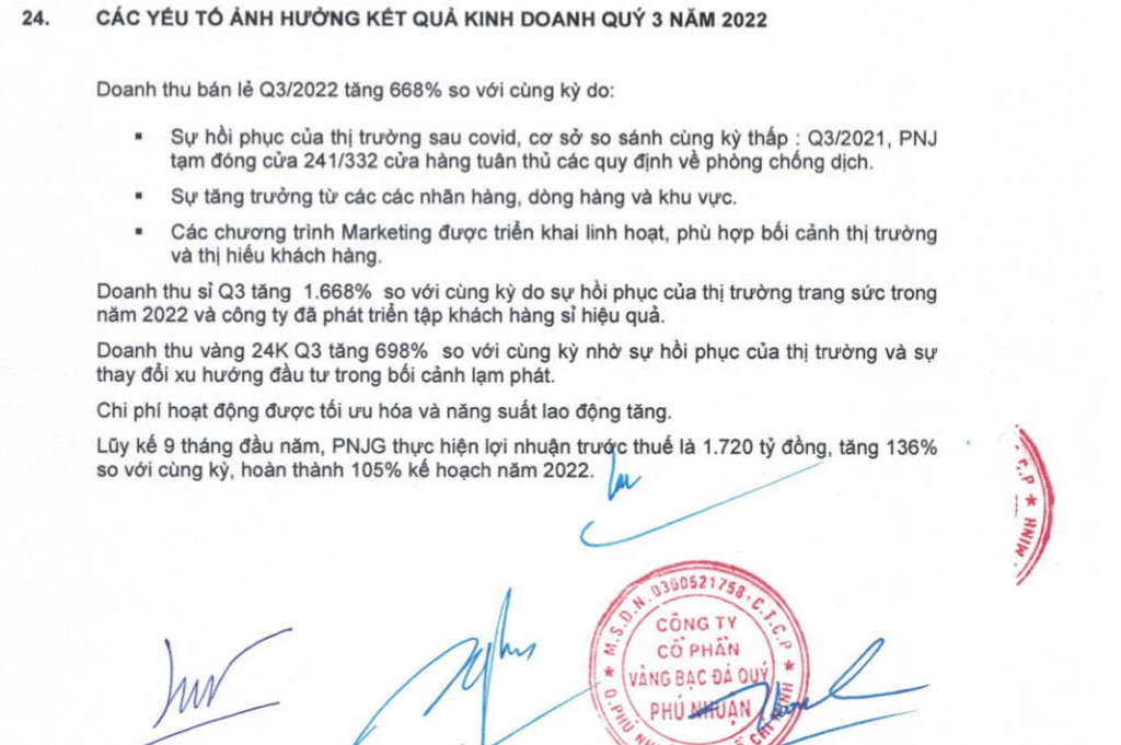 Lũy kế 9 tháng năm 2022, PNJ đạt lợi nhuận trước thuế 1.720 tỷ đồng, tăng 136% so với cùng kỳ. Doanh nghiệp đã hoàn thành 105% kế hoạch của cả năm 2022.
