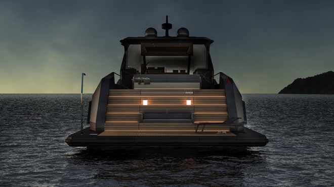 Bên khoang dưới là khu vực nghỉ ngơi với một dàn ghế sofa. Ở phía trên của nó là một quầy bar ngoài trời cùng khu vực linh hoạt có thể sử dụng để sắp xếp tới 12 chỗ ngồi quanh bàn ăn, đặt rạp chiếu phim ngoài trời hoặc làm khu vực tắm nắng.
