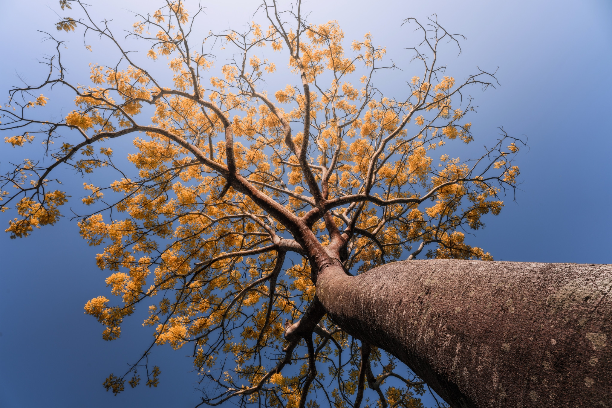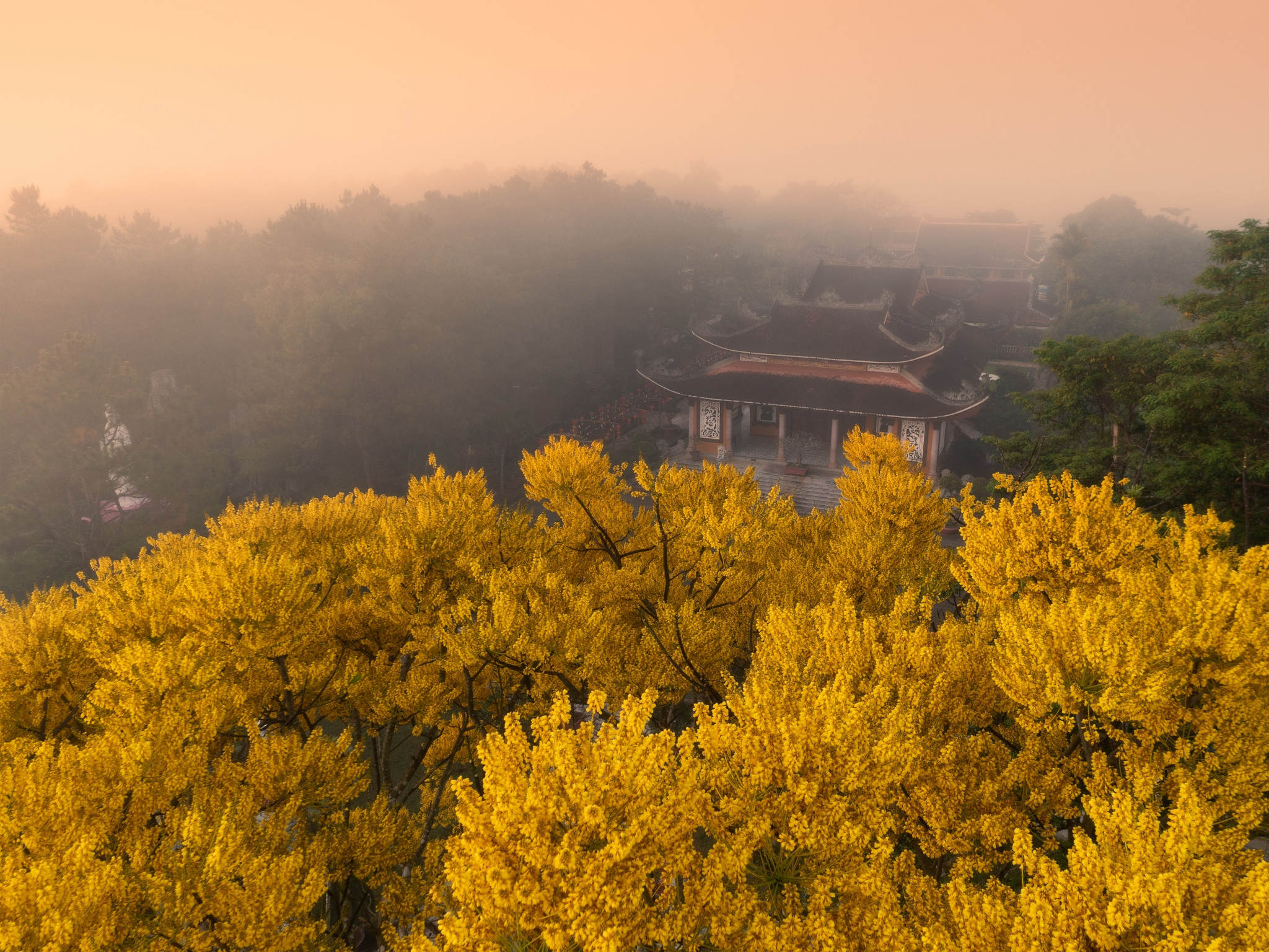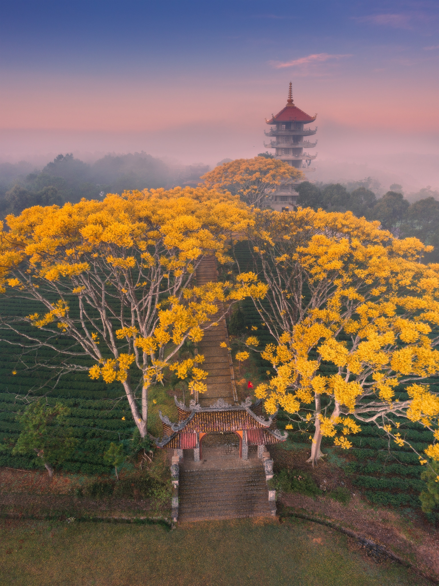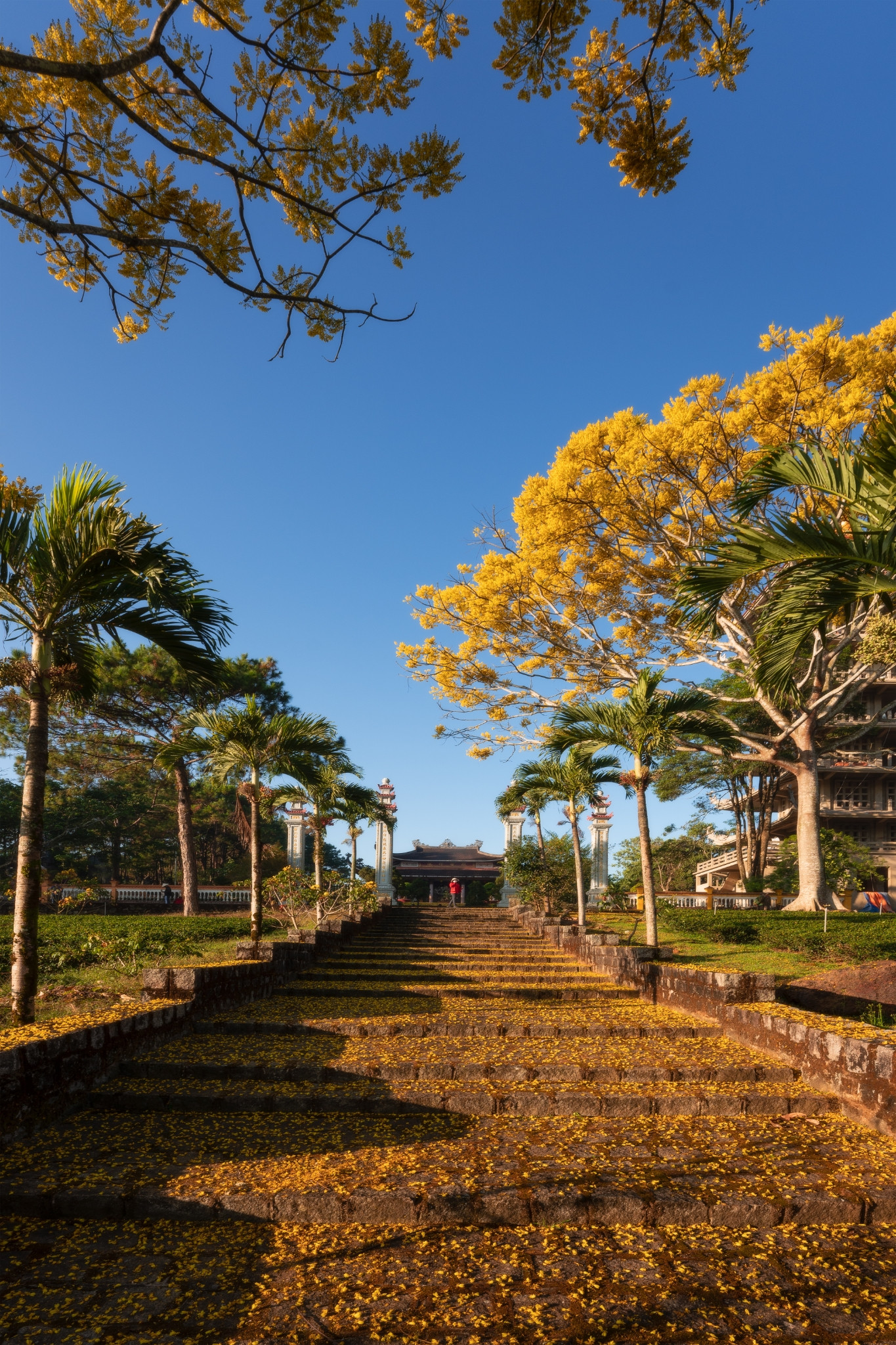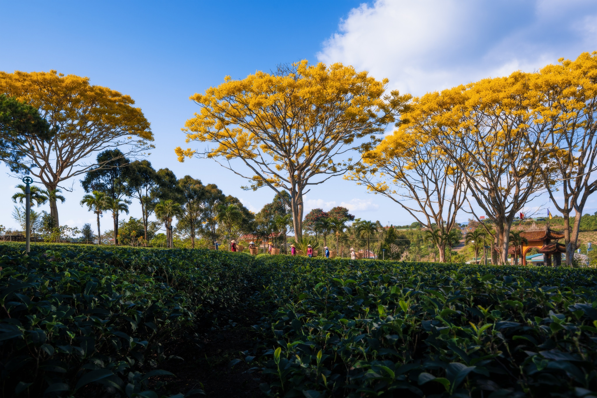 Ở thành phố Bảo Lộc hiện có khoảng 15 cây phượng vàng được trồng tại các khu vực khác nhau như nhà thờ Giáo xứ Tân Thanh (xã Lộc Thanh), trường Cao đẳng Công nghệ - Kinh tế Bảo Lộc, trường THPT Châu Á Thái Bình Dương (đường Huỳnh Thúc Kháng, phường 2) và một cây được trồng ở phường Lộc Sơn, đối diện bến xe Thành Bưởi.Riêng tu viện Bát Nhã (xã Đam B’ri) được trồng 5 cây dọc theo lối bậc thang hướng lên cổng chính. Cứ mỗi độ xuân về, hoa bung nở rực rỡ, khoe sắc vàng tươi, tạo khung cảnh lãng mạn đẹp như phim.Tu viện Bát Nhã là một trong những điểm du lịch tâm linh hút khách bậc nhất tỉnh Lâm Đồng. Không chỉ sở hữu kiến trúc đậm chất Á Đông đầy mê hoặc, tu viện còn tọa lạc tại vị trí có phong cảnh hữu tình, không khí trong lành, dễ chịu.Theo người dân địa phương, hoa phượng vàng thường nở vào cuối tháng 1 dương lịch, kéo dài đến hết rằm tháng Giêng. Tùy thời tiết từng năm mà hoa nở rộ hay lác đác. Tuy nhiên, đây vẫn là điểm đến được nhiều du khách ghé tham quan và vãn cảnh.Phượng vàng còn có tên gọi khác là Phật Y. Đây là loài hoa quý hiếm có xuất xứ từ Brazil với phần thân thẳng và phân nhánh ở gần đỉnh. Mỗi đầu ngọn có 10-12 cành hoa chính, mỗi cành chính gồm 6-8 cành phụ, mỗi cành phụ lại mang 30-40 nụ bông, mọc thành chùm khá đẹp mắt.Từng tới tu viện Bát Nhã hồi đầu năm 2022, nhiếp ảnh gia Cao Kỳ Nhân không khỏi choáng ngợp trước khung cảnh mùa hoa phượng vàng nở rộ, xung quanh được bao bọc bởi những đồi chè xanh bạt ngàn.Từ Bảo Lộc, du khách đi theo hướng tới thác Dam B’ri khoảng 15km, nhìn bên tay trái sẽ thấy tu viện, tọa lạc trên một ngọn đồi rộng khoảng 25ha.Những cây phượng vàng ở đây cao lớn và xòe tán đều đẹp. Anh Nhân chia sẻ, bản thân cảm thấy dễ chịu, thư thái khi tản bộ trong tu viện, trên con đường ngập tràn sắc hoa phượng vàng.Vào mùa phượng vàng nở, sắc vàng của hoa hòa cùng màu xanh của nền trời, của đồi chè, mang lại cảm giác yên bình cho du khách.