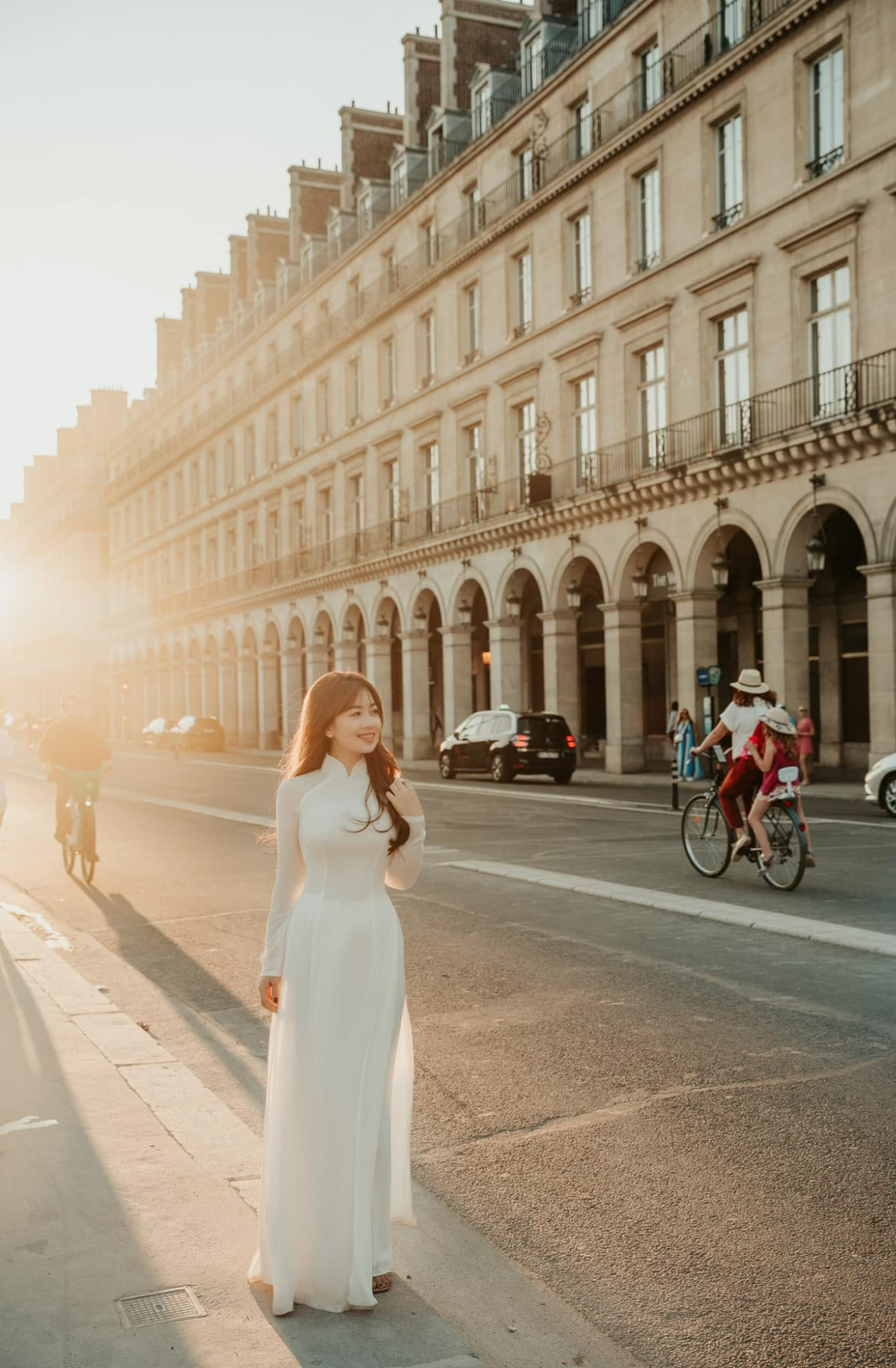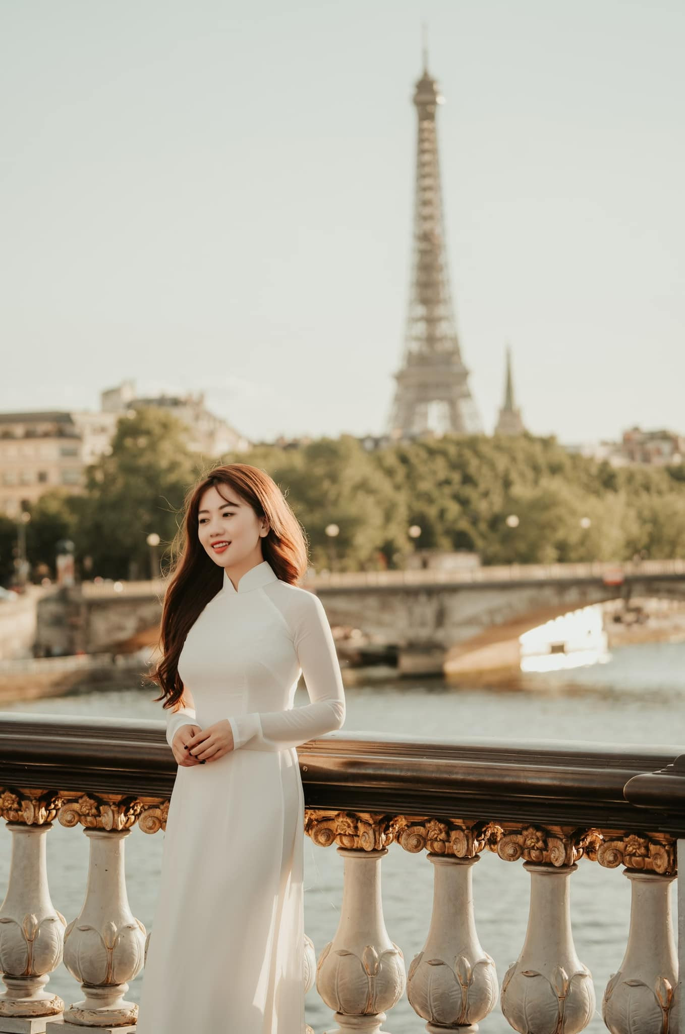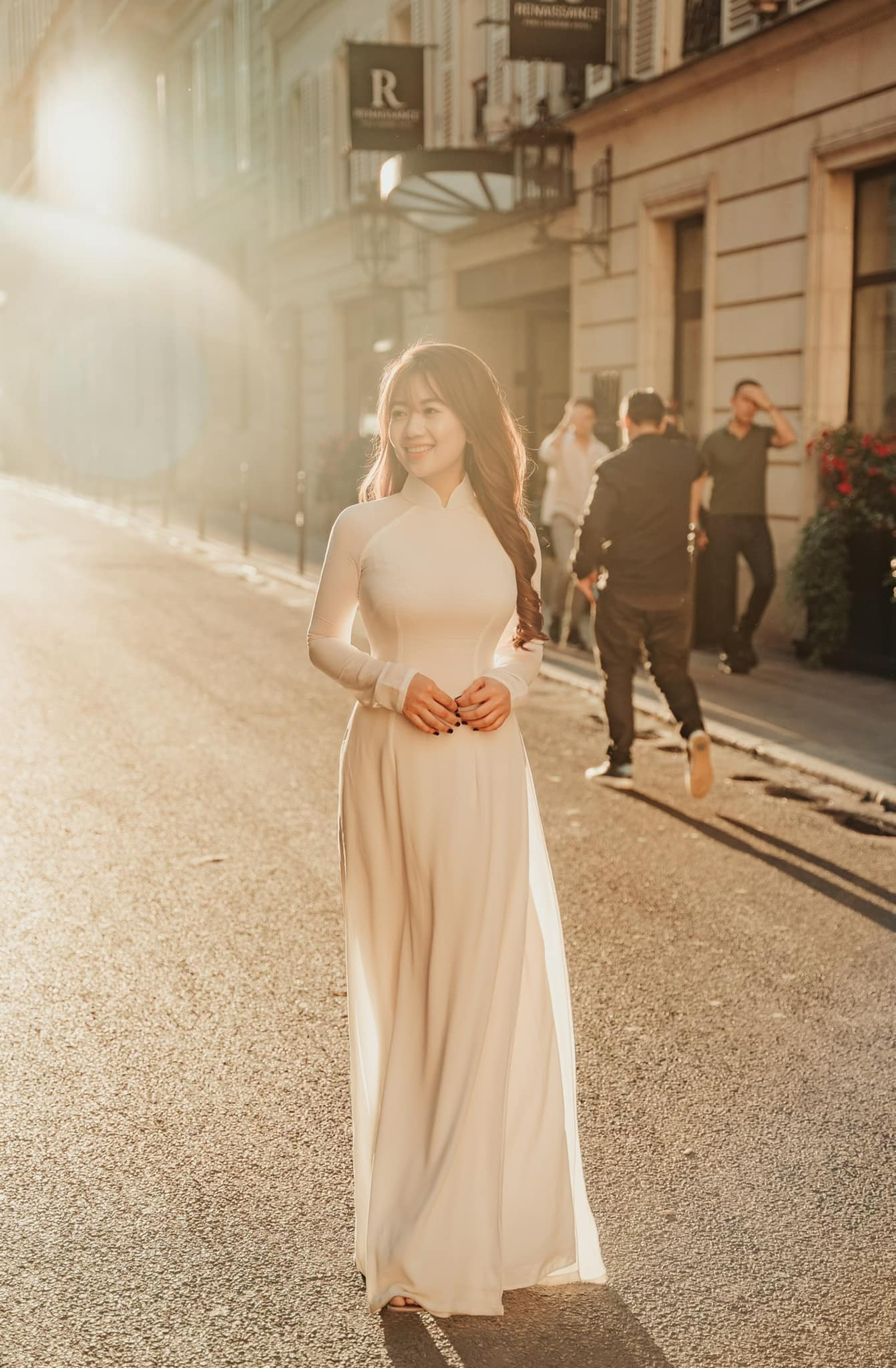 Đầu tháng 7, vì ông xã bận công tác, chị Hà Diệu Linh (sinh năm 1989, Hà Nội) một mình đưa con gái 6 tuổi sang Pháp thăm gia đình và du lịch. Đây là chuyến "xuất ngoại" đầu tiên của chị sau Covid-19. Từng khám phá nhiều quốc gia châu Âu nên trong lần trở lại này, hai mẹ con chị Linh chủ yếu tham quan Paris và các thành phố của Pháp. "Mình mang theo bộ áo dài trắng với dự định thực hiện bộ ảnh áo dài trong chiều hoàng hôn Paris làm kỉ niệm. Mình rất bất ngờ khi bộ ảnh nhận được sự yêu thích trên mạng xã hội", người mẹ 8x chia sẻ.