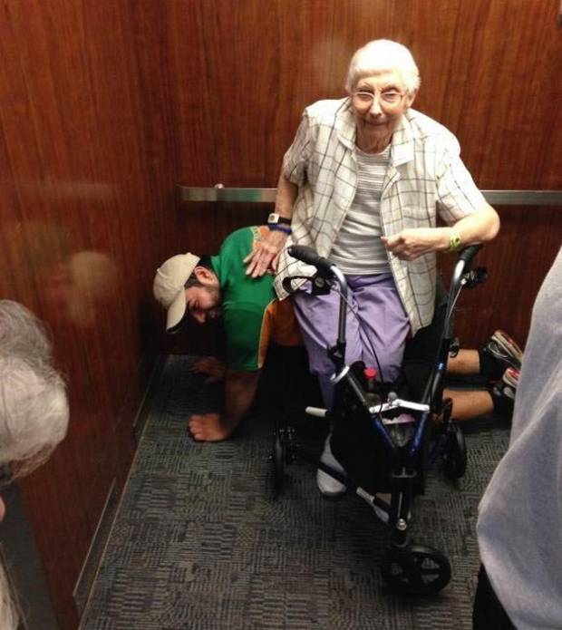 Anh giải thích với ông chủ “Chúng tôi cùng lên tầng với một cụ bà. Ngay khi thang máy bị kẹt, cụ nói cụ không thể đứng lâu được”.