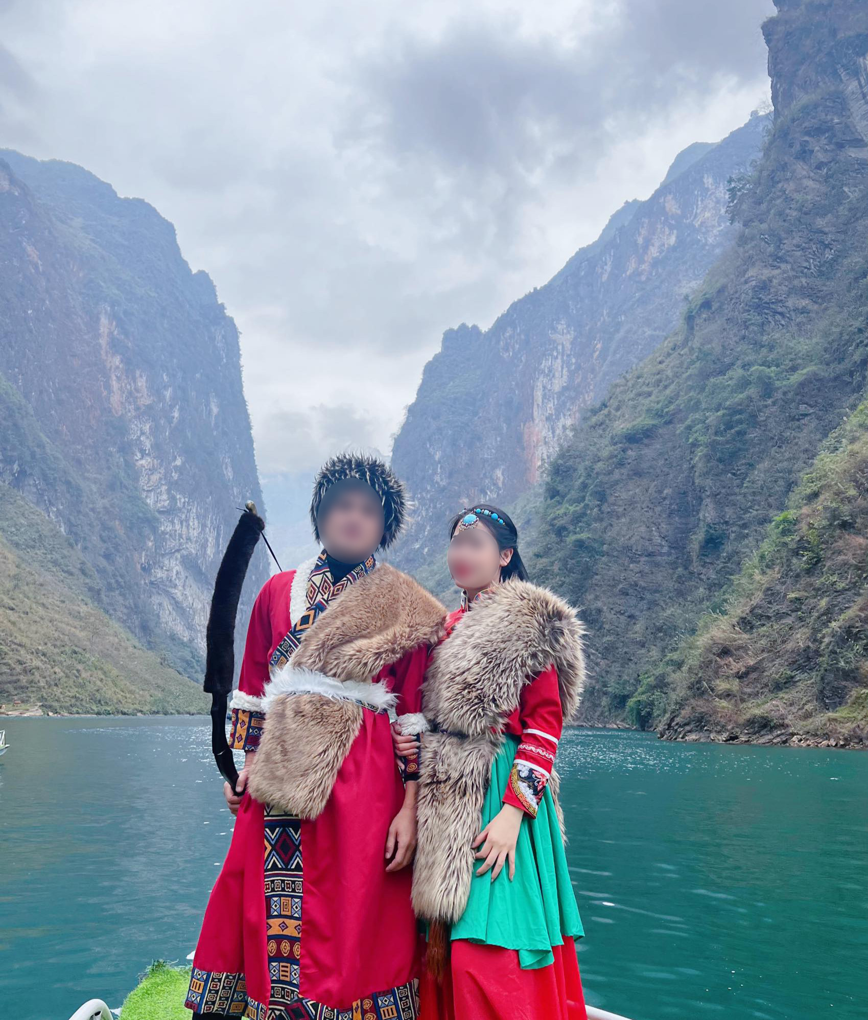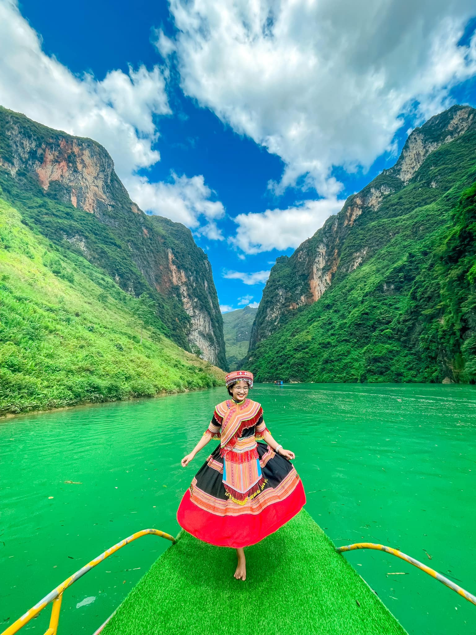 Du khách xúng xính trong những bộ trang phục truyền thống của các dân tộc Việt khi tham quan trên sông Nho Quế (Ảnh: Ngọc Như Ý Nguyễn, Vũ Minh Khang, Trần Thị Thùy).
