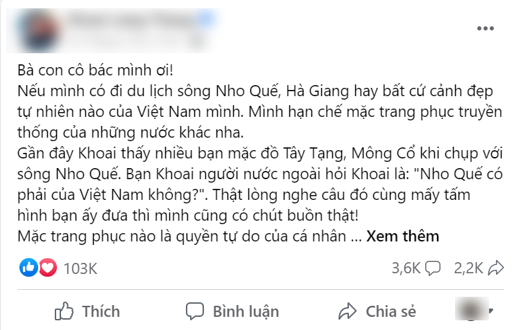 Trước đó, một travel blogger có tiếng đã đăng tải bài viết trên trang cá nhân phản ánh thực trạng nhiều du khách trong nước diện trang phục truyền thống của người Mông Cổ, Tây Tạng khi đến tham quan tại sông Nho Quế.