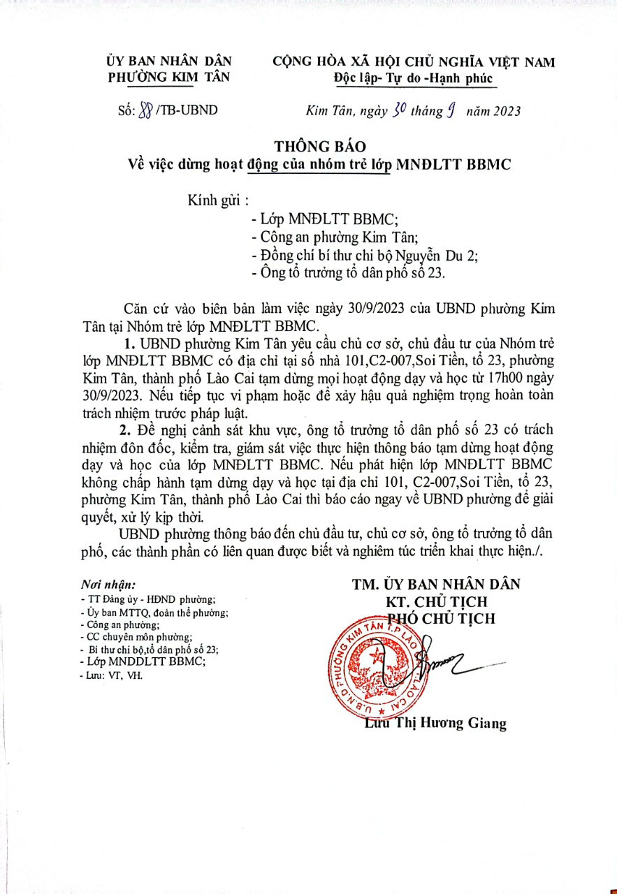 Trao đổi với PV VietNamNet, ngày 2/10, bà Lưu Thị Hương Giang, Phó Chủ tịch UBND phường Kim Tân, TP Lào Cai, tỉnh Lào Cai, cho biết, đơn vị đã ra thông báo về việc dừng hoạt động đối với đối với nhóm trẻ Mầm non độc lập tư thục BBMC.