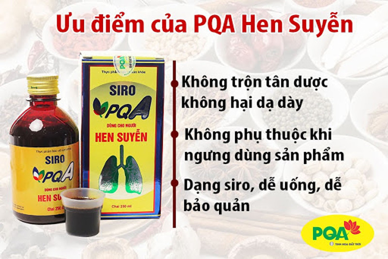 Từ quan điểm trên, Dược phẩm PQA giới thiệu thực phẩm bảo vệ sức khoẻ (TPBVSK) siro PQA dùng cho người hen suyễn. Với thành phần có nguồn gốc từ các loại thảo dược như cam thảo, hoàng cầm, hậu phác, tang bạch bì, chích thảo, tô tử,... TPBVSK siro PQA với công dụng hỗ trợ giải cảm, hoá thấp, hỗ trợ thông phế, bình suyễn, hỗ trợ thông thoáng đường thở cho người hen suyễn… có thể dùng được cho những người bị khó thở, thở khò khè, hen suyễn, hen phế quản mãn tính kinh niên, viêm phổi tắc nghẽn mạn tính COPD.