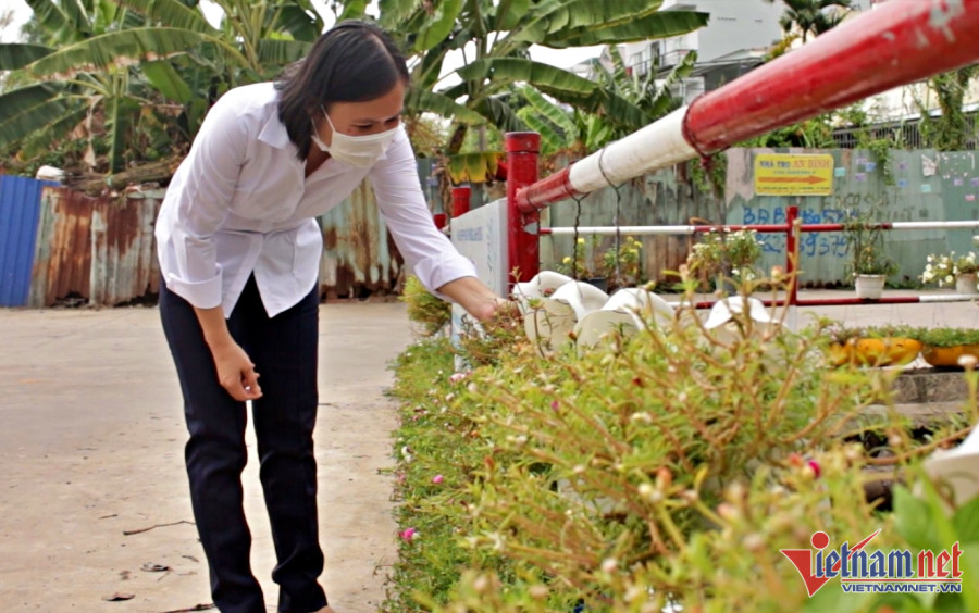 Trời vừa hửng nắng, bà Nguyễn Thị Kim Hoàng (60 tuổi, tổ 6, khu phố 8, phường Linh Đông, TP.Thủ Đức, TP.HCM) tất bật mở nước, kéo ống ra Cống Quay tưới những chậu hoa được trồng trên vô số vật liệu tái chế.