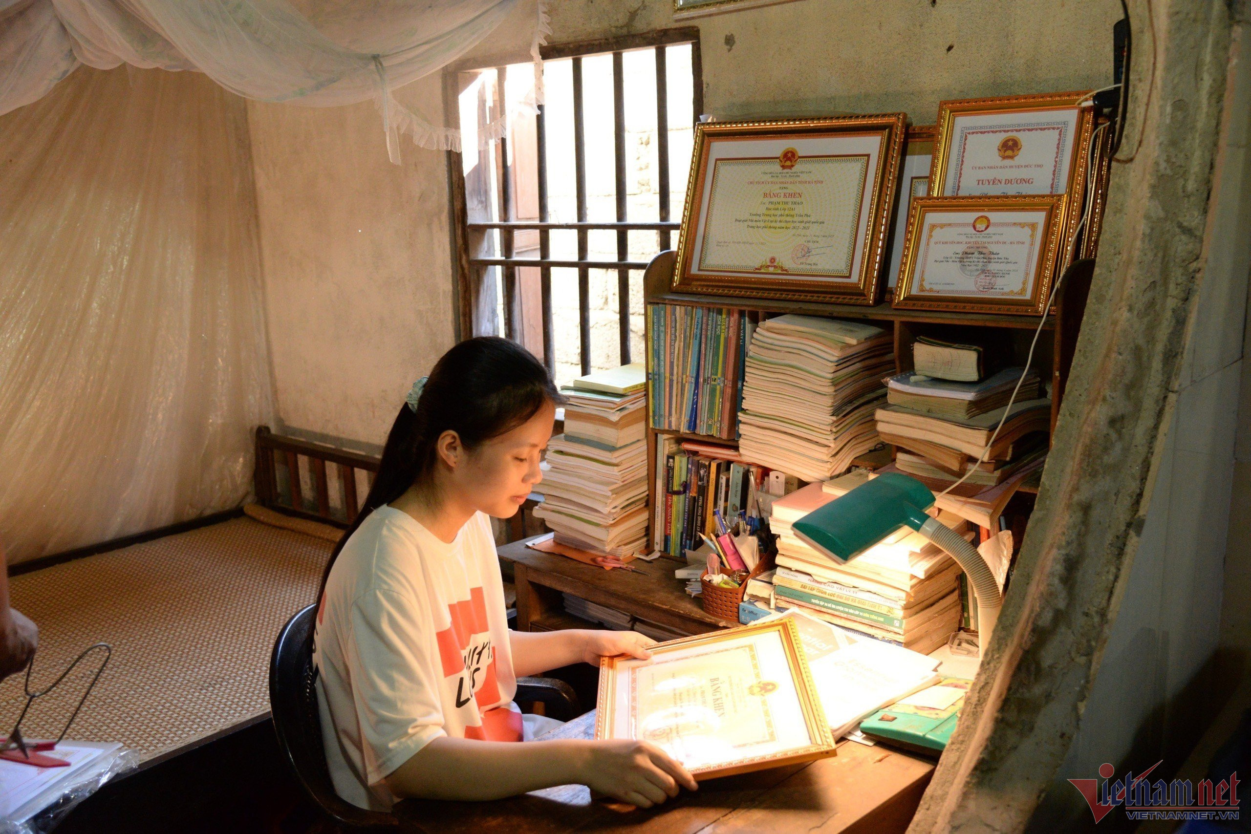 Trong căn nhà cấp 4 ẩm thấp, chật chội, Thảo vẫn cố gắng bố trí góc học tập khoa học. “Gia tài” giấy khen, bằng khen của em phải bỏ túi cất gọn bớt để chỗ sắp sách vở.
