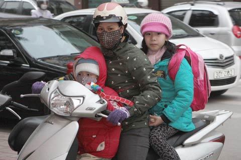 Tan trường, em nào cũng được các bà mẹ trùm thật kín để tránh rét.