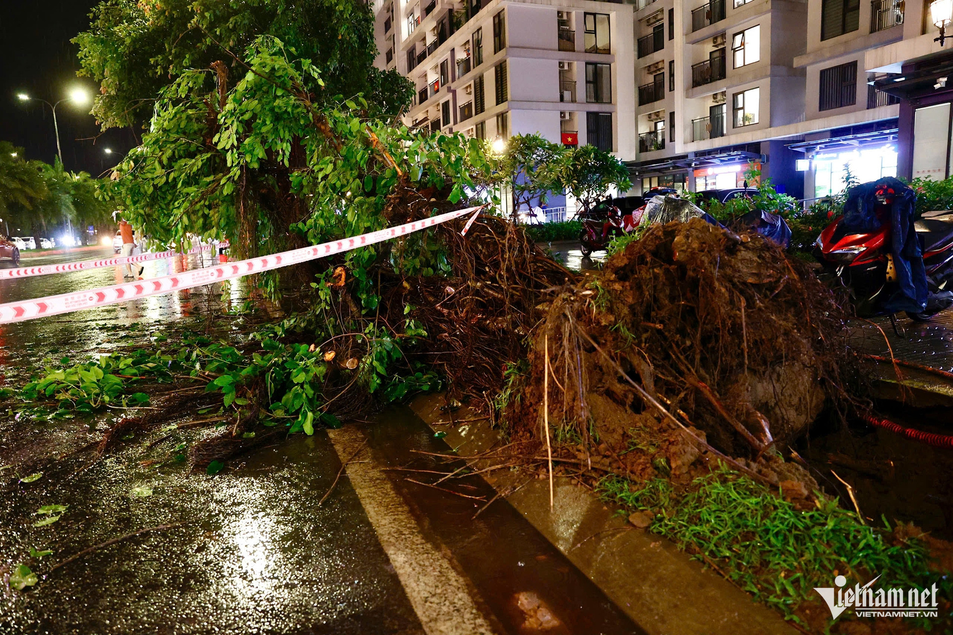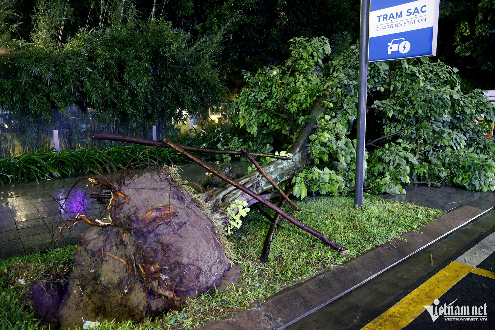 Một số cây xanh trong khu đô thị Vinhomes Smart City bị bật rễ đổ xuống ngay trong lúc gió mạnh.