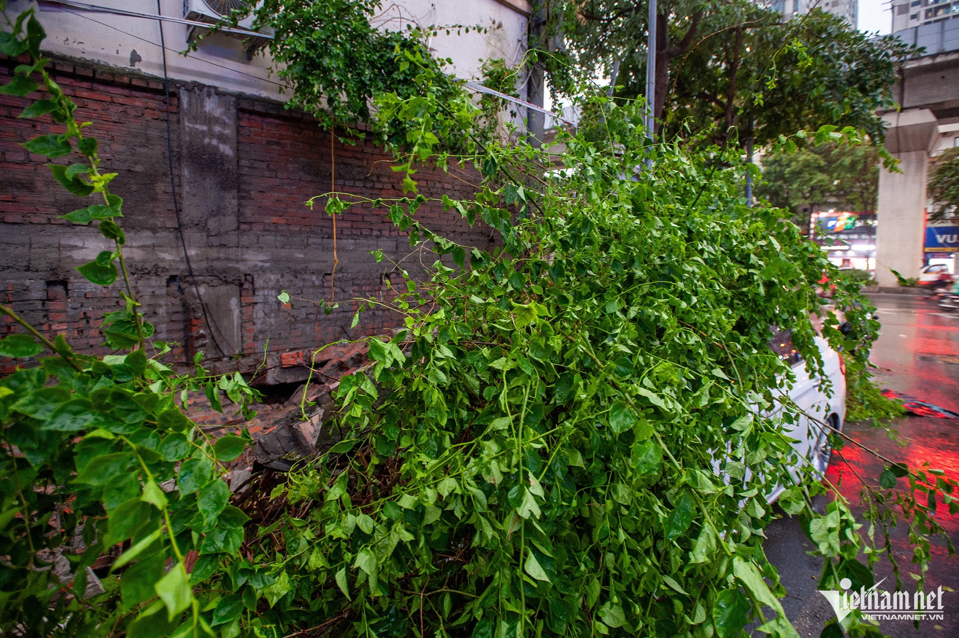 Tại đại lộ Thăng Long đoạn gầm cầu vượt Phú Đô, một cây phượng gãy đổ đè lên chiếc ô tô đang đỗ bên lề đường.