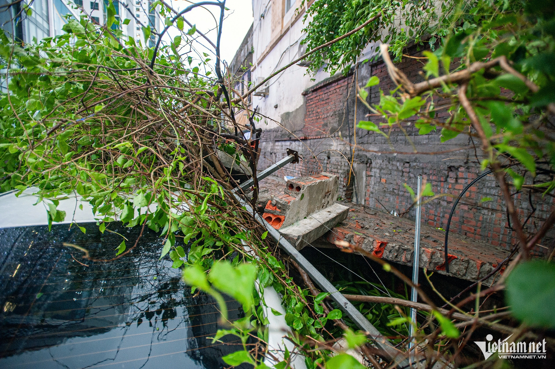 Một mảng tường rào đổ sập đè lên ô tô trước cửa nhà số 275 Nguyễn Trãi.