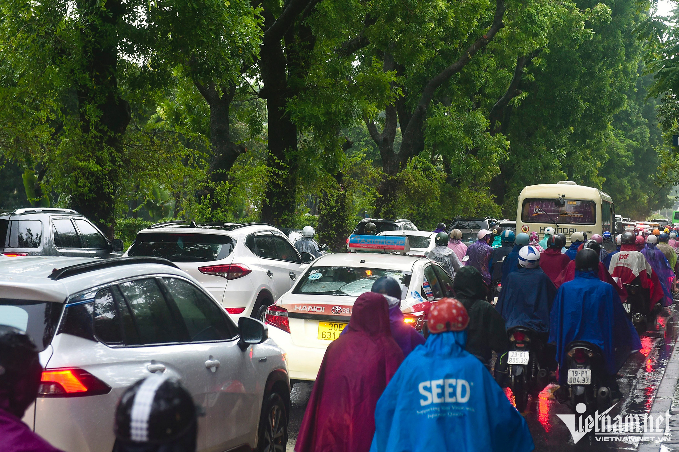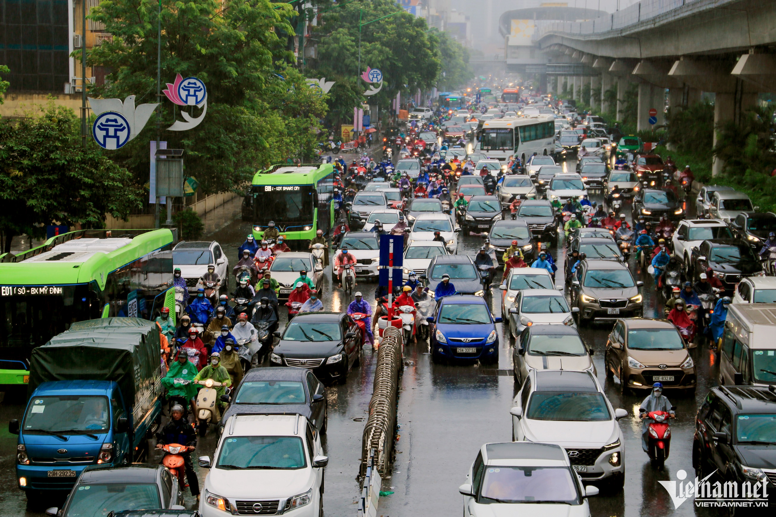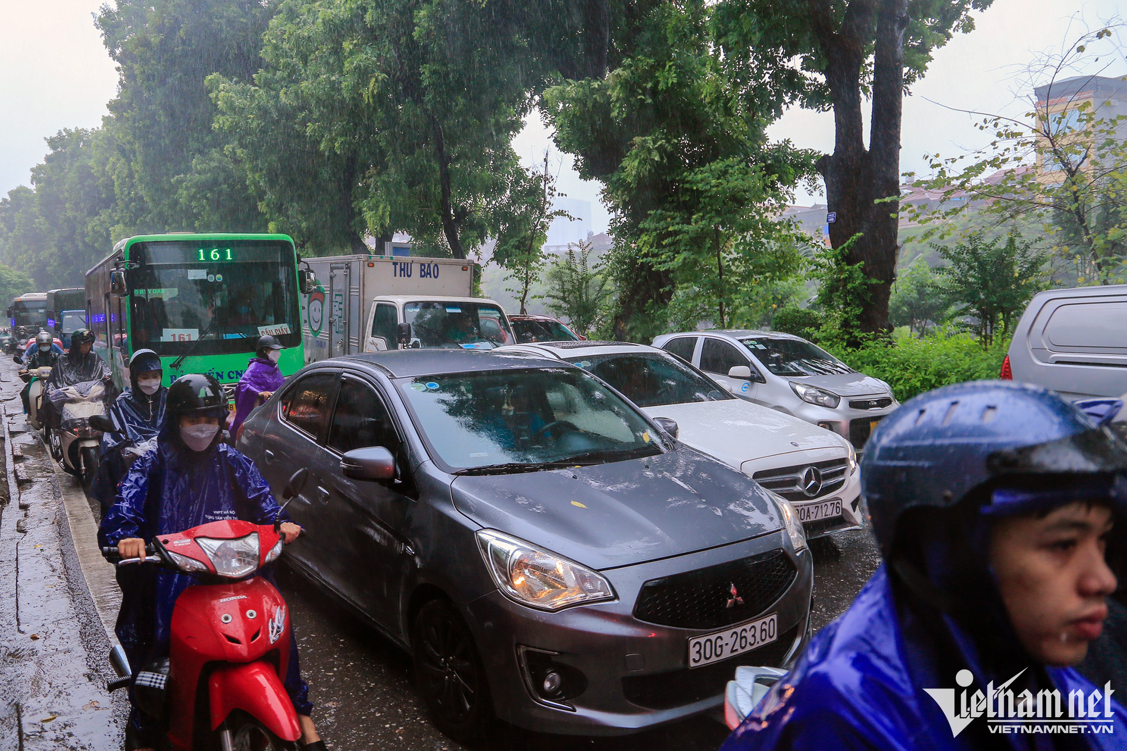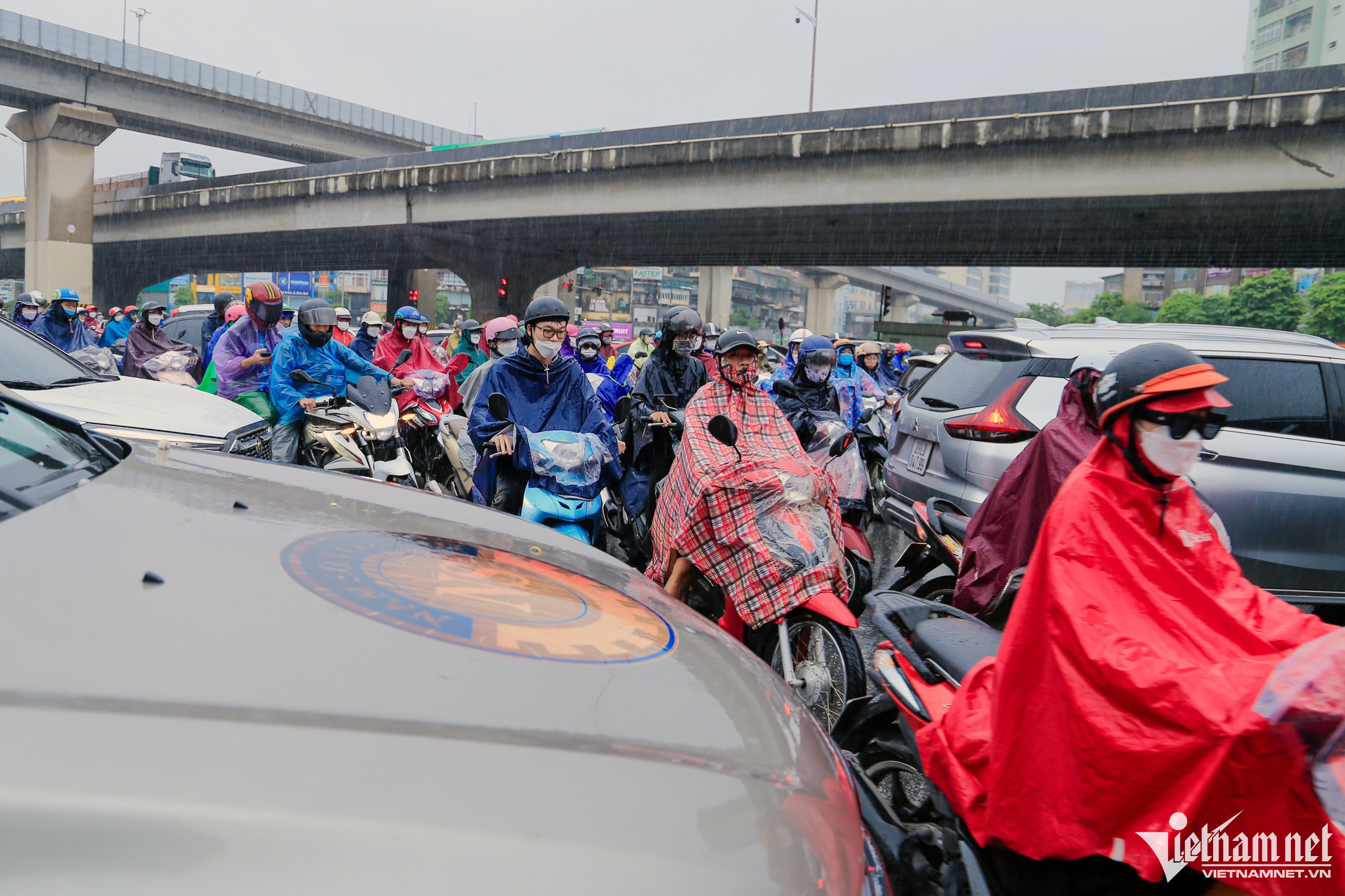 8h30, cảnh ùn tắc kéo dài nhiều km tại đường Nguyễn Trãi hướng đi Nguyễn Xiển, Khuất Duy Tiến. Ôtô, xe máy không tuân thủ theo biển báo, dải phân cách cứng bị vô hiệu hóa. Phía xa có nhiều xe máy đột ngột chuyển làn Tại nút giao 4 tầng Nguyễn Xiển - Khuất Duy Tiến, hàng nghìn phương tiện nhích từng chút chờ lưu thông qua ngã tư. Do bị muộn giờ đi làm, nhiều người không còn cách nào khác đành phóng xe lên vỉa hè để vượt qua khu vực kẹt cứng.Hệ thống đèn tín hiệu bị vô hiệu hóa, ngã tư rối loạn, ôtô, xe máy tranh nhau vượt lên khi thấy có khe hở.Xe buýt là phương tiện di chuyển chính của Luận để đi làm từ quận Hà Đông lên khu vực Cầu Giấy. “Tôi đã đợi hơn 90 phút nhưng vẫn chưa có xe nào. Có thể hôm nay trời mưa, tắc đường, phương tiện công cộng di chuyển khó khăn”, nam thanh niên nói.9h tại đường Lê Văn Lương kéo dài, 2 hàng ôtô chật cứng. Một tài xế cho biết đã không thể nhúc nhích ở khu vực này gần 20 phút. Do lối vào Lê Văn Lương từ Khuất Duy Tiến có công trình làm hầm chui, các vũng nước xuất hiện, việc di chuyển của người đi xe máy trở nên khó khăn.Dưới đường chật ních người và phương tiện, trên xe buýt lại vắng vẻ, không ai phải đứng.Tài xế xe bus cho biết đã dừng đợi khoảng 30 phút để di chuyển qua đường Lê Văn Lương. "Tôi thấy do đường đang có công trình thi công, thêm trời mưa nữa việc ùn tắc không thể không xảy ra”, anh nói. Cảnh tương tự tại phố Kim Mã (quận Ba Đình). Từ 7h đến hơn 9h, nơi đây vẫn chưa hết ùn tắc.Dù biết rằng ra đường lúc này buộc phải đánh vật với giao thông và mất nhiều thời gian mới tới nơi cần đến, nhiều người không còn lựa chọn nào khác.9h50, cảnh ùn tắc kéo dài vẫn diễn ra tại đường Láng (quận Đống Đa).Ôtô chiếm toàn bộ các làn đường đánh bật người đi xe máy buộc phải leo lên vỉa hè tại tuyến đường này.