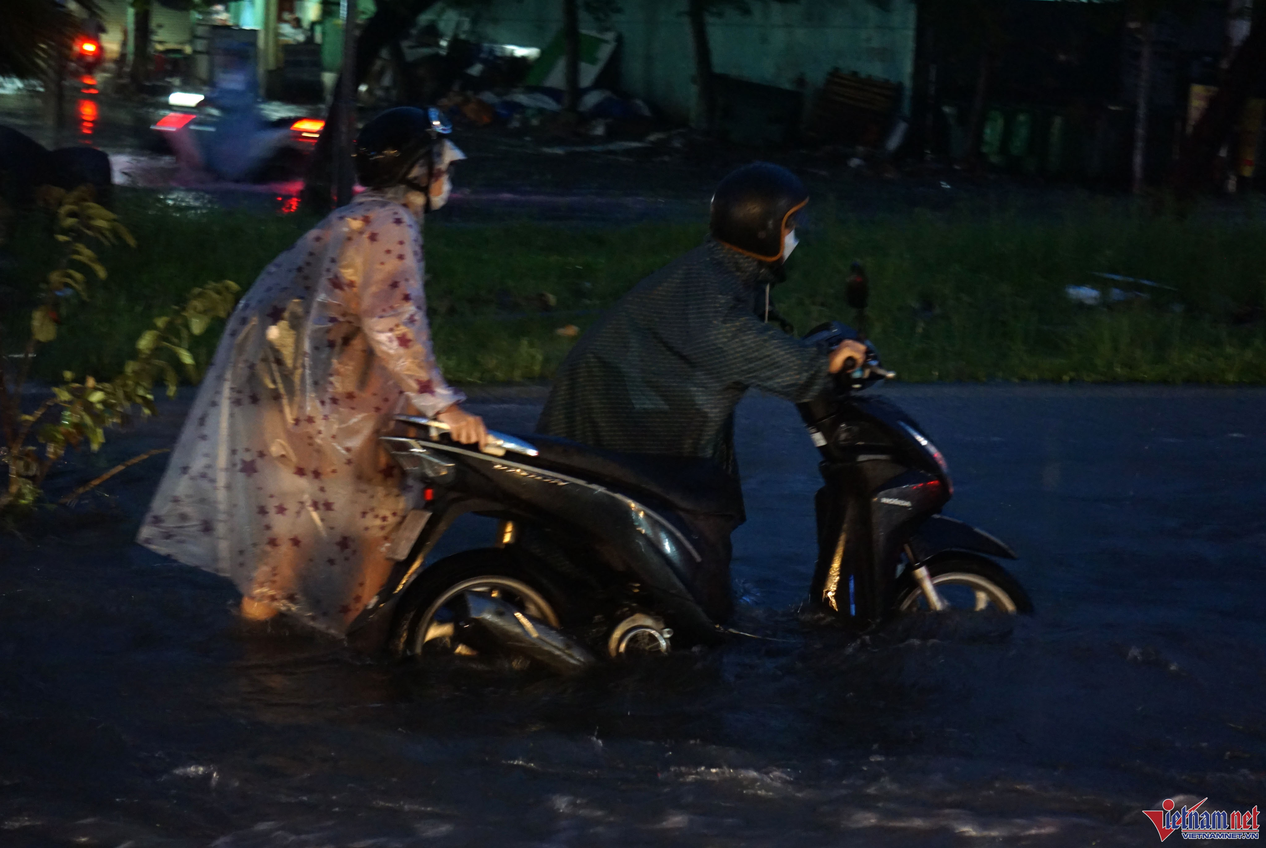 Mưa lớn kéo dài do ảnh hưởng của bão số 5 khiến hầu hết các tuyến đường ở Đà Nẵng bị ngập sâu, hàng loạt xe bị chết máy, người dân vất vả dắt bộ về nhà sau giờ tan ca.
