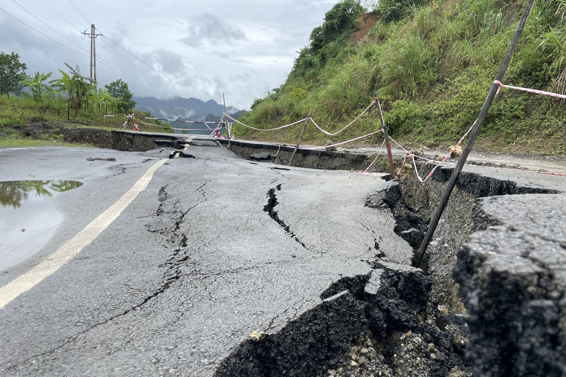 Tại hiện trường, một đoạn đường bị sụt lún, nứt toác làm đứt gãy mặt và nền đường, tạo thành các rãnh dài khoảng 2m đến 3m. Chiều dài đoạn đường bị hư hỏng kéo dài hàng chục mét.
