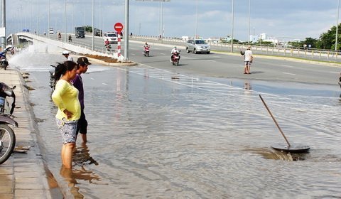 Chiều 28/6, chúng tôi có mặt tại đầu cầu Lò Gốm trên đường Võ Văn Kiệt (P10.Q.6 TP.HCM) chứng kiến trụ nước cứu hỏa trên lề đường tuôn nước xối xả. Nước phun trắng xóa, chảy tràn lan trên lòng đường tràn vào nhà dân cư ngụ gần đó.