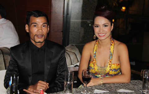 Siêu mẫu Vũ Cẩm Nhung và MC Thanh Mai tíu tít bên nhau trong suốt bữa tiệc. Nếu như Vũ Cẩm Nhung gây ấn tượng với "kiểu đầu Cẩm Vân" và cách trang điểm ấn tượng thì Thanh Mai kém sắc hơn bởi trang điểm mặt hơi đậm so với làn da.