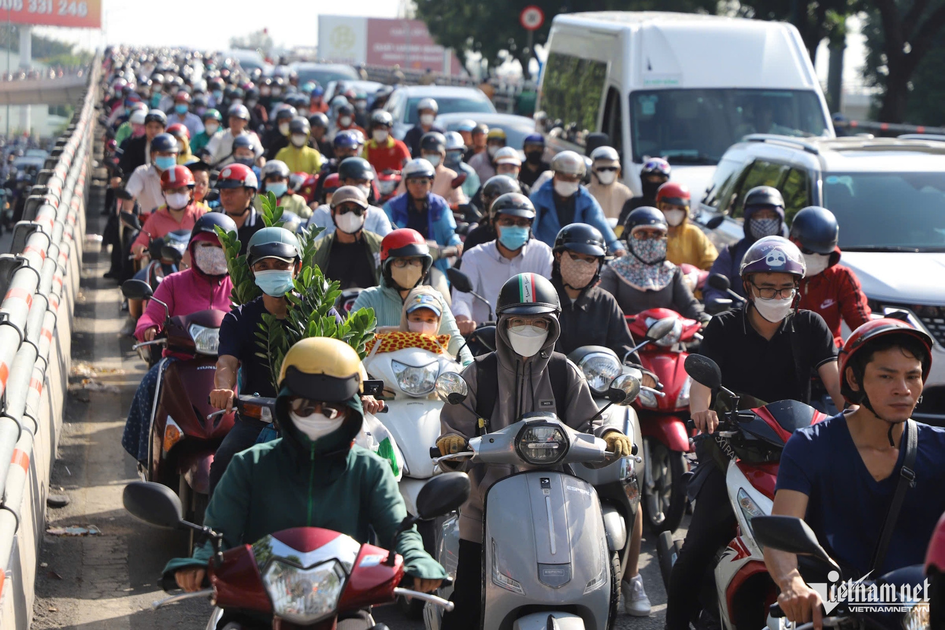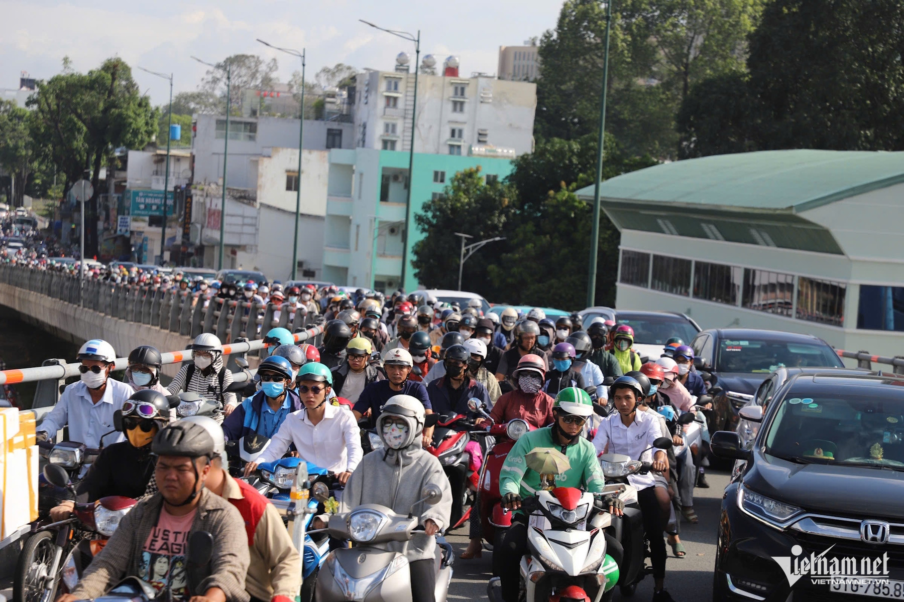 Sáng 4/9, nhiều tuyến đường là 'điểm nóng' giao thông của TPHCM đều xảy ra ùn tắc kéo dài như trục đường Cộng Hoà - Trường Chinh (quận Tân Phú, Tân Bình); đường Đinh Bộ Lĩnh (quận Bình Thạnh). Nguyên nhân là do hôm nay, người dân quay trở lại với công việc, học sinh đến trường sau kỳ nghỉ lễ kéo dài 4 ngày.Lúc gần 8h, đường Quang Trung, quận Gò Vấp, theo hướng vào trung tâm TPHCM, dòng xe nối dài, nhích từng mét từ khu vực chợ Hạnh Thông Tây đến cầu vượt ngã 6 Gò Vấp.Tương tự, dòng xe nối dài, chen kín mặt đường Nguyễn Kiệm, hướng từ Nguyễn Oanh qua cầu vượt ngã 6 Gò Vấp để vào trung tâm TPHCM.Cảnh kẹt xe liên hoàn tại nút giao cầu vượt Nguyễn Thái Sơn, đây cũng là cửa ngõ vào sân bay Tân Sơn Nhất. Trên cầu vượt, dưới dạ cầu và cả tuyến đường Nguyễn Kiệm đều tê liệt.