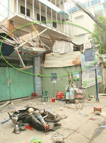 Trên mái nhà 68, các thanh sắt quật ngã mái tôn và bảng hiệu. Trước sân công trình xây dựng tòa cao ốc 7 tầng, khung trục kéo nâng hàng rơi nằm chắn ngang lối ra vào…