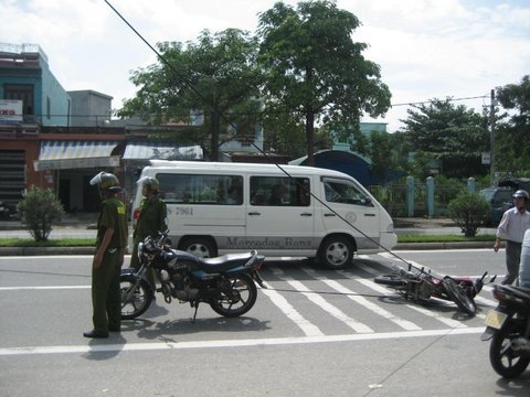 Khi đến trước số nhà 376 đường Tôn Đức Thắng thì bất ngờ bị một dây điện từ trên cao bị đứt, rơi xuống khiến người và xe Trung ngã lăn ra đường.