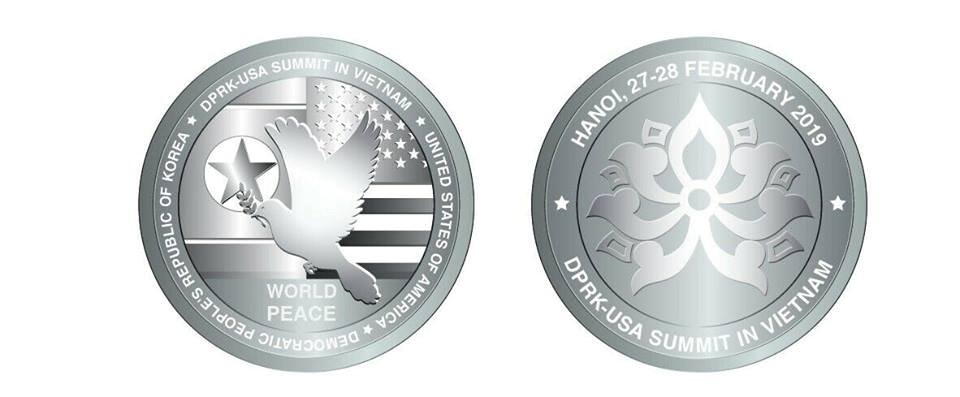 Đồng xu bạc có đường kính 3,5cm, một mặt in hình con chim bồ câu biểu tượng của Hòa bình Thế giới và quốc kỳ của 3 nước Mỹ, Triều Tiên và Việt Nam. Một mặt là hình hoa sen của Việt Nam và ghi ngày, tháng đánh dấu Hội nghị thượng đỉnh mang tính lịch sử này.