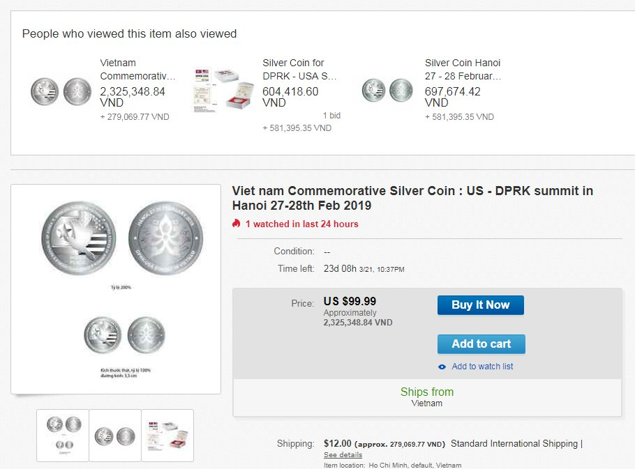 Trên trang thương mại điện tử Ebay, đồng xu bạc kỷ niệm Hội nghị thượng đỉnh Mỹ Triều của Việt Nam được rao bán giá 100 USD, ngoài ra người mua sẽ phải trả thêm phí ship từ Việt Nam là 12 USD nữa. Tổng cộng người mua ở nước ngoài phải chi khoảng 112 USD (2,6 triệu VNĐ) để sở hữu đồng xu bạc kỷ niệm của Việt Nam.