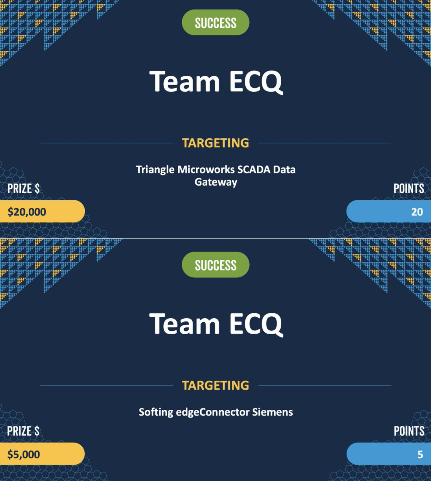 Lần đầu tham gia cuộc thi, đội ngũ kỹ thuật của ECQ đã khai thác thành công hai lỗ hổng zero-day trong hệ thống điều khiển công nghiệp (ICS) và hệ thống giám sát và điều khiển dữ liệu (SCADA), đạt tổng 25 Master of Pwn và giành giải thưởng 25.000 USD.