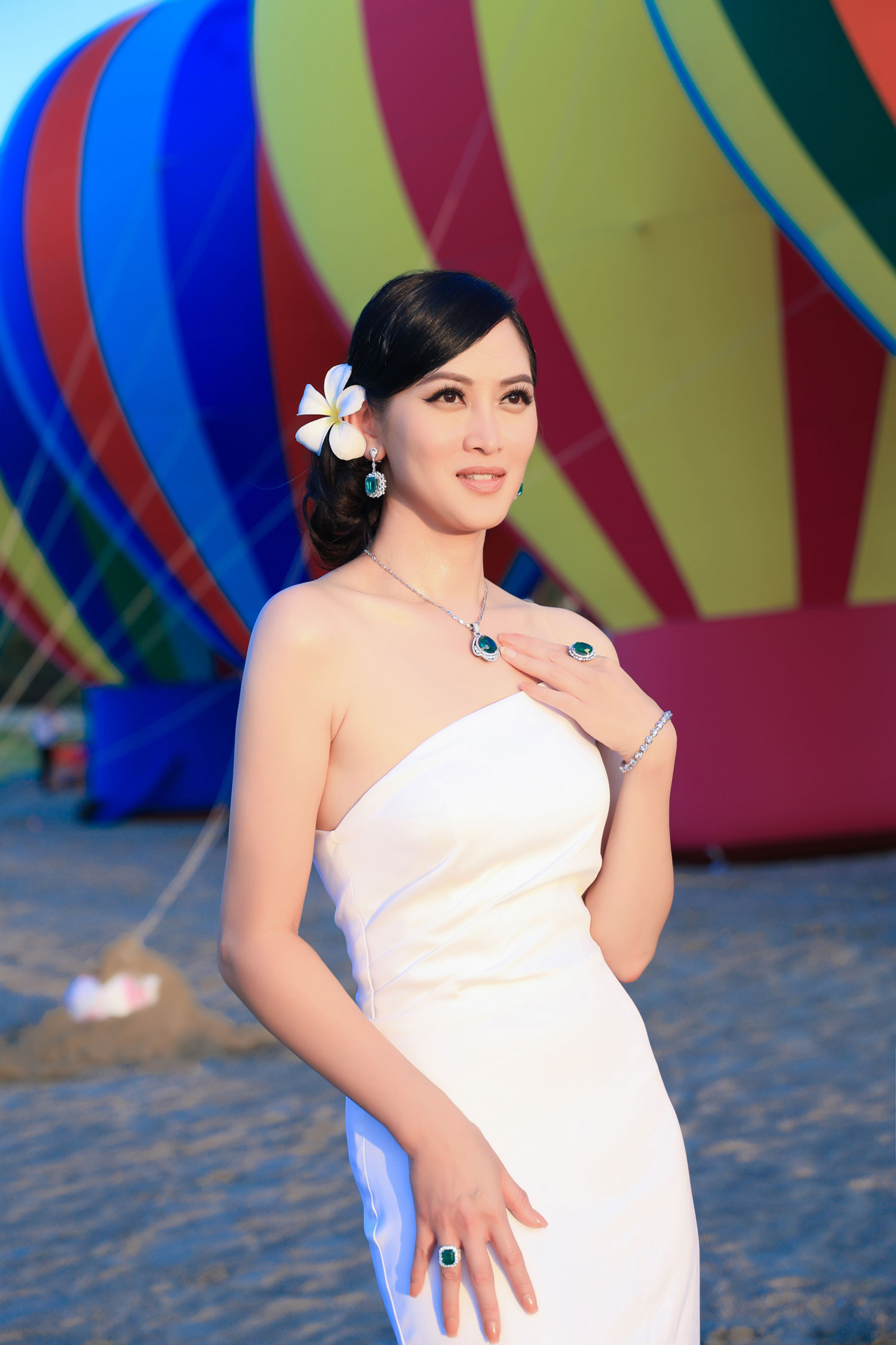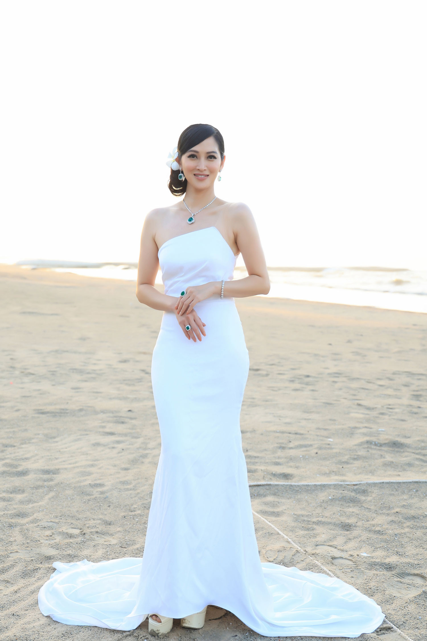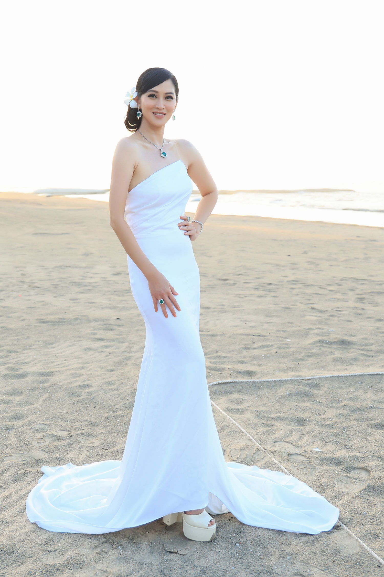 Xuất hiện tại sự kiện 'Hoa hậu Đại dương Việt Nam 2023', Elizabeth Thủy Tiên gây chú ý khi chọn chiếc váy trắng ôm sát cơ thể, tôn đường cong nóng bỏng do Đức Vincie thiết kế. Điểm nhấn của bộ trang phục là chi tiết cúp ngực và phom dáng đuôi cá với chân váy dài hơn 1m, được cắt may đơn giản nhưng đầy tinh tế. Để tổng thể trở nên hoàn chỉnh, cựu mẫu 9X phối với bộ trang sức trị giá triệu USD. Dù mang trang sức đắt tiền nhưng Elizabeth Thủy Tiên không lựa chọn trang phục từ một thương hiệu lừng danh nào mà chọn Đức Vincie bởi "yêu mến tài năng của nhà thiết kế này". Theo tiết lộ của Đức Vincie, Elizabeth Thủy Tiên có yêu cầu khá cao khi đặt thiết kế trang phục. Anh đã lên ý tưởng thực hiện bộ váy vừa tôn lên lợi thế vóc dáng của người mẫu 9X, vừa giữ được sự thanh lịch, kín đáo phù hợp với vai trò giám khảo của cô tại cuộc thi Hoa hậu Đại dương.Chia sẻ về cuộc sống hiện tại, người đẹp cho biết đã rời sàn diễn để chú tâm vào kinh doanh đấu giá bất động sản và cổ vật. Elizabeth Thủy Tiên sống rất hạnh phúc cùng chồng làm bác sĩ và hai con.