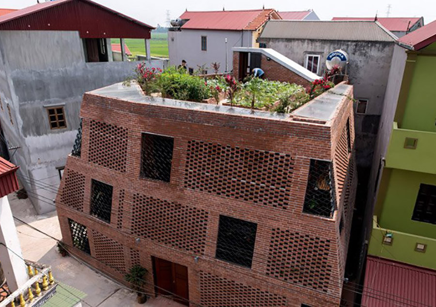 The double-layer perforated brick design surrounding this house gives occupants the feeling of living in the midst of nature.