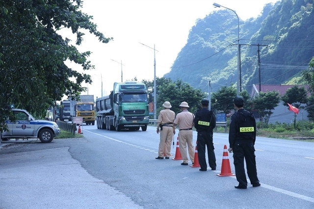 | Traffic police on duty check vehicles on Highway 1A in Chi Lăng District, the northern mountainous province of Lạng Sơn. — VNA/VNS Photo Anh Tuấn |