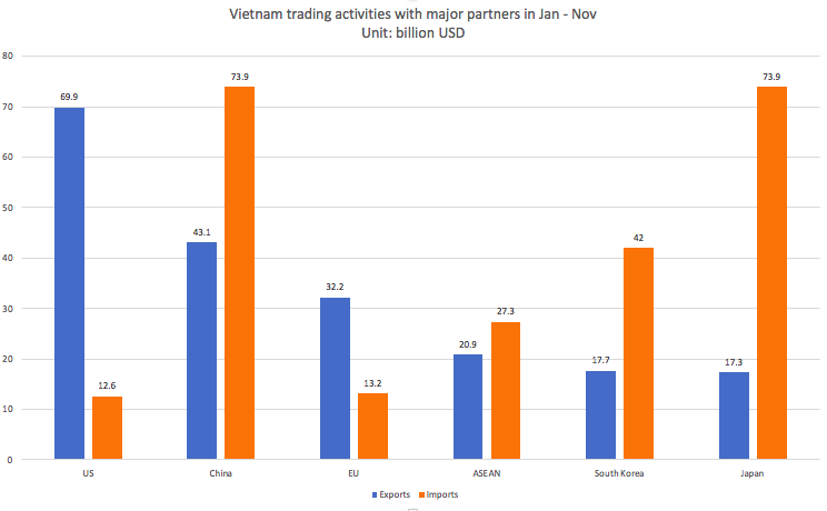 In the January–November period, the US remained Vietnam's biggest export market, spending US$69.9 billion on Vietnamese goods, up 25.7% year-on-year, followed by China (US$43.1 billion, up 16%), and the EU (US$32.2 billion, down 2.4%).