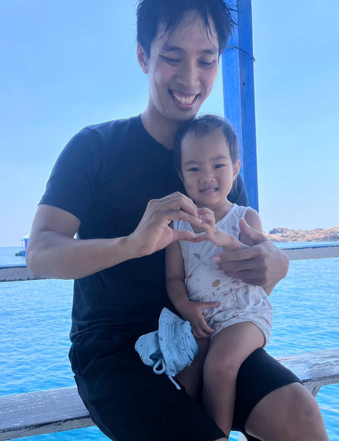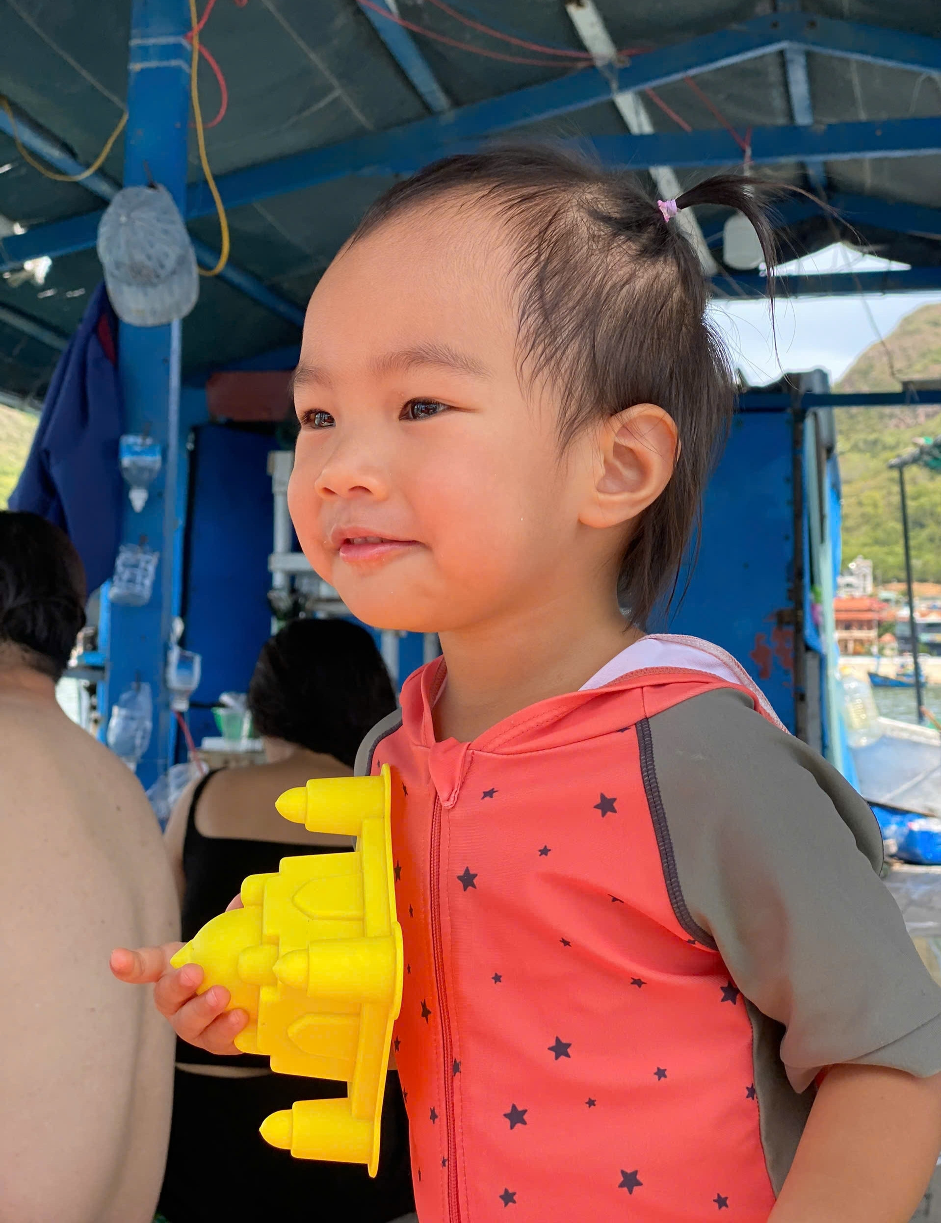 Moc Tra, who regularly dives with her father in Nhon Hai, can hold her breath underwater for 15 to 25 seconds at a time. This early exposure to water activities has not only improved her physical health but also boosted her confidence. She now enjoys exploring marine life with her father, including fish and coral reefs.