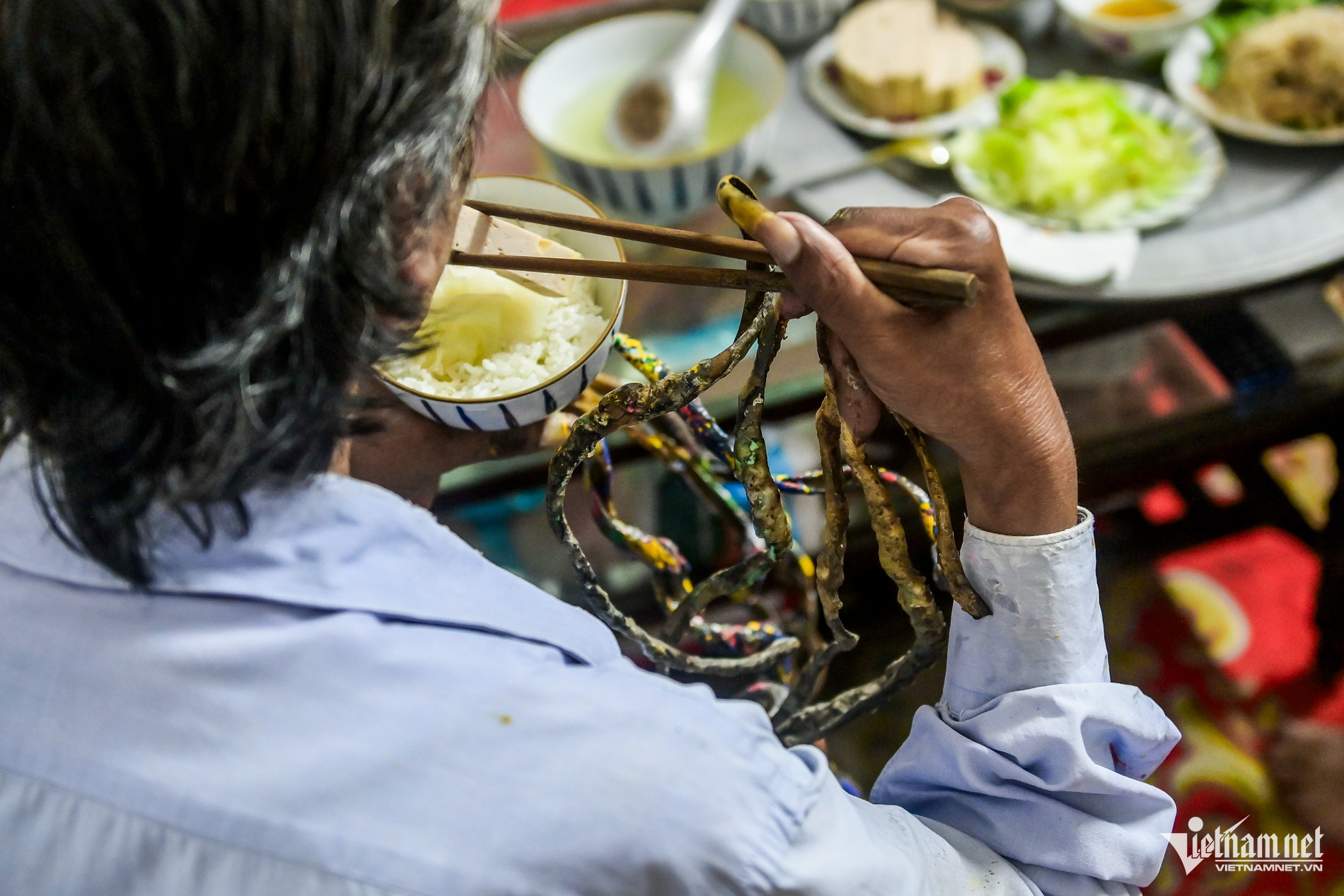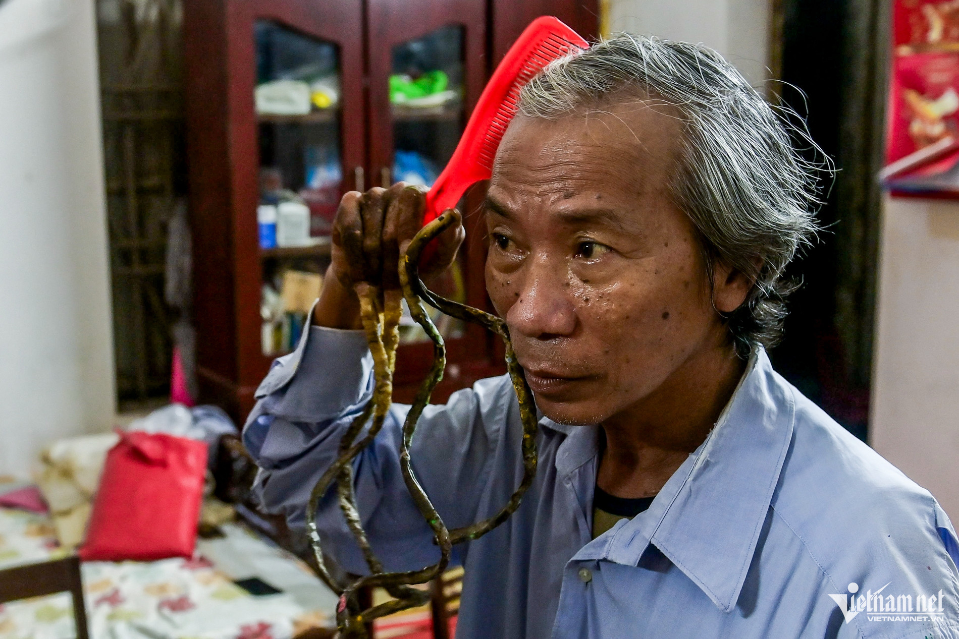 Daily life has become increasingly challenging. Huyen now relies on his wife to help him bathe and get dressed. His fingers have lost their flexibility due to the weight of the nails. He can no longer clench or spread his hand and must keep it stiffly extended at all times.